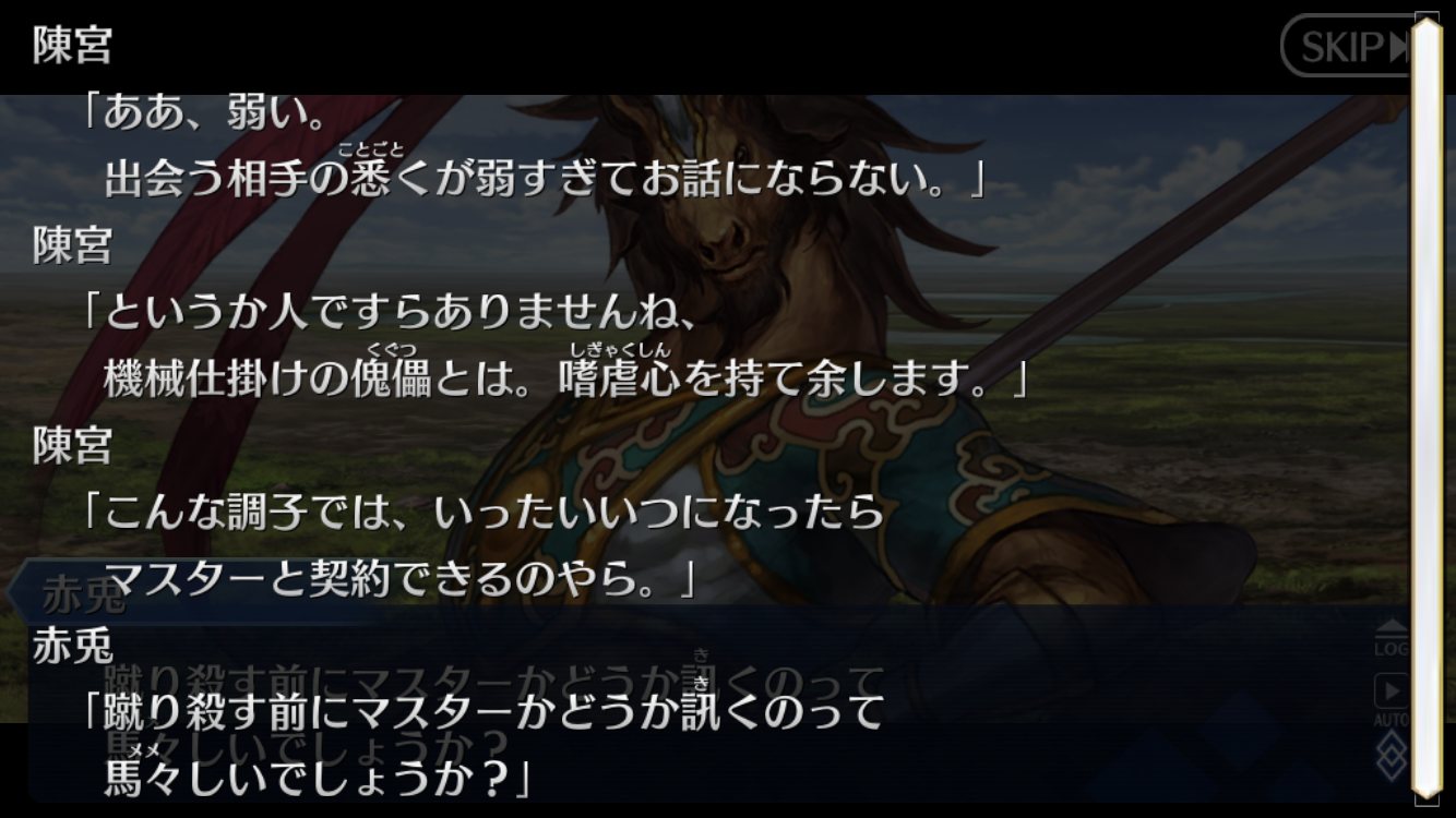 赤兎馬な外見だし真名も赤兎だから十中八九赤兎馬なんだろうけど何でこのナマモノ喋ってるんだろうか…たぶん虞美人実装するならはPU2じゃなく、