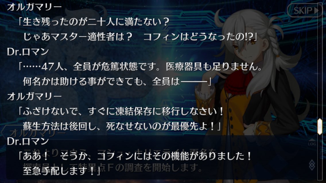 さらに人理焼却については「人理とやらは焼却し、過去は消え去るだろう。だが、それは我々には関係のない話だ。予想外であっても、予定を変える程でもない」とも言っているので、ぐだの人理修復が成功するか失敗するかはおそらくクリプターの蘇生には関係ない流石にもう真祖とか出ないだろと思うけどマリスビリーが脅威過ぎて4章が恐怖