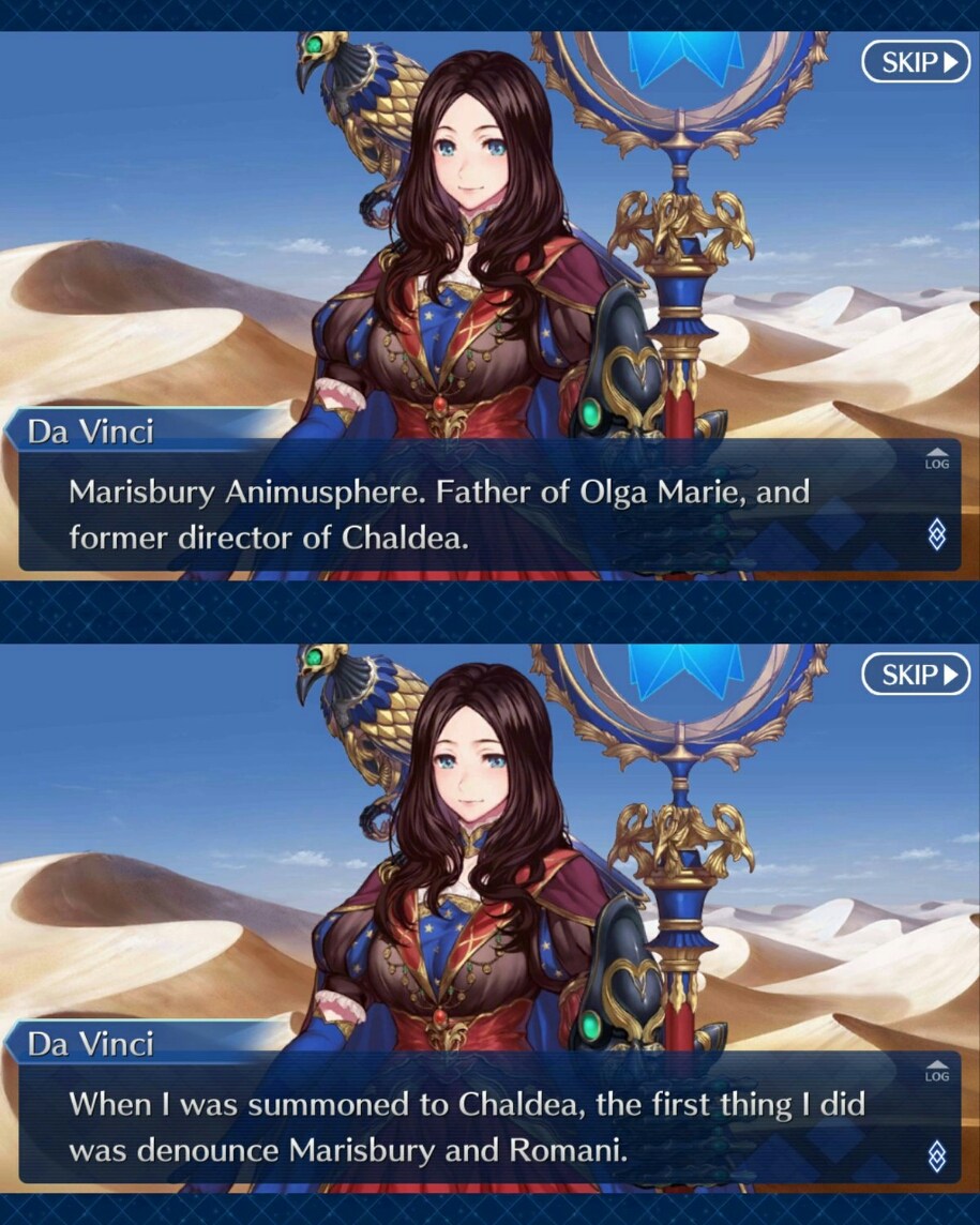 ダヴィンチちゃんはロマニと知り合いの画家件美術大の先生。たまに専門学校や高校にも講義をしにいく。理系から美大に入ったタイプで、物理も数学もできる。たまたま同じ居酒屋でロマニと会ってそれ以来飲み仲間に。ロマニの悩みや愚痴を聞いたり、生物の体の構造について討論もどきをする。