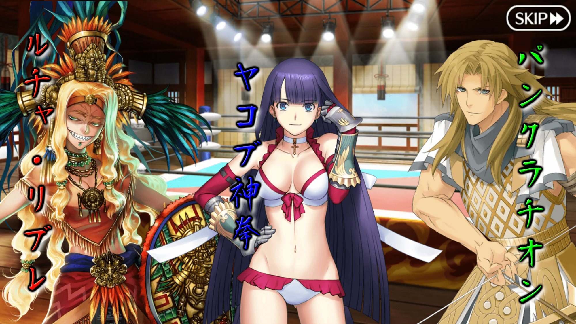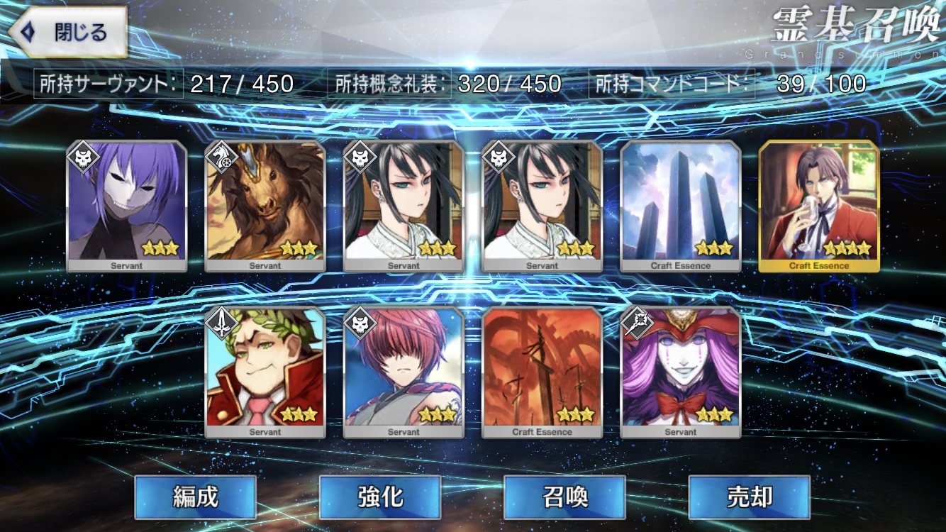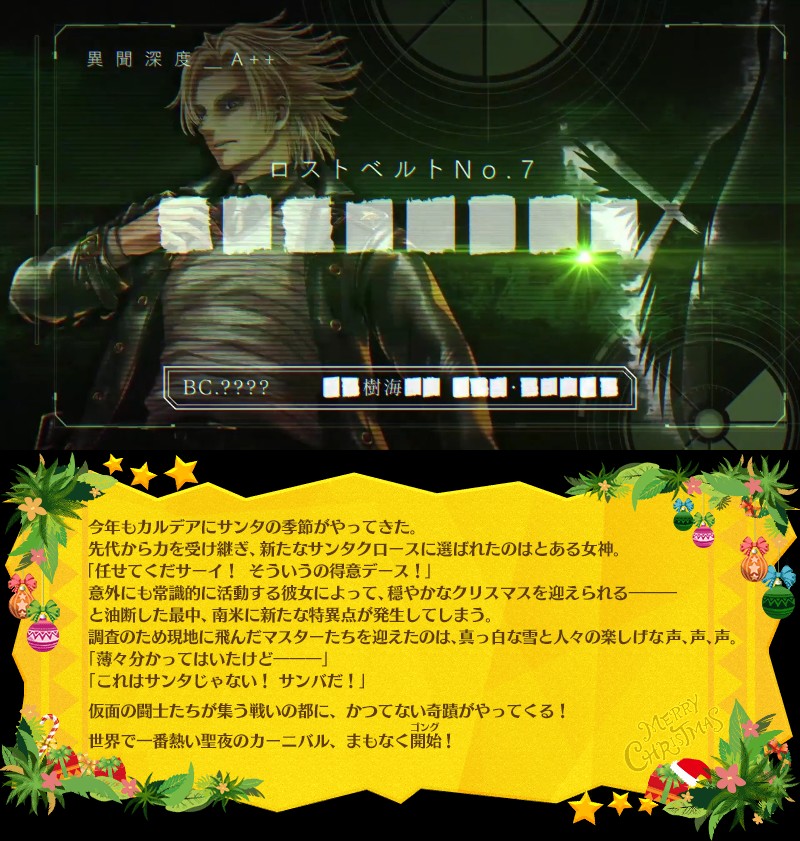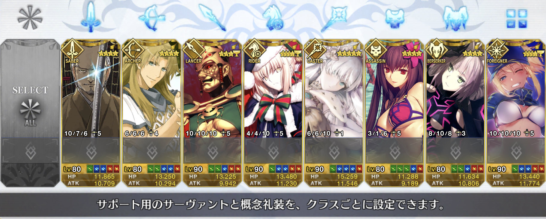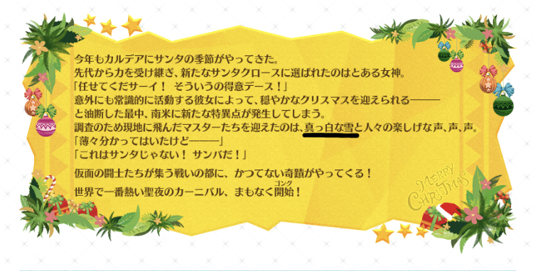 ジャンヌ・ダルク、天草四郎、水着マルタ、シャーロック・ホームズ、始皇帝、ケツァルコアトル(サンタ/サンバ)、カール大帝