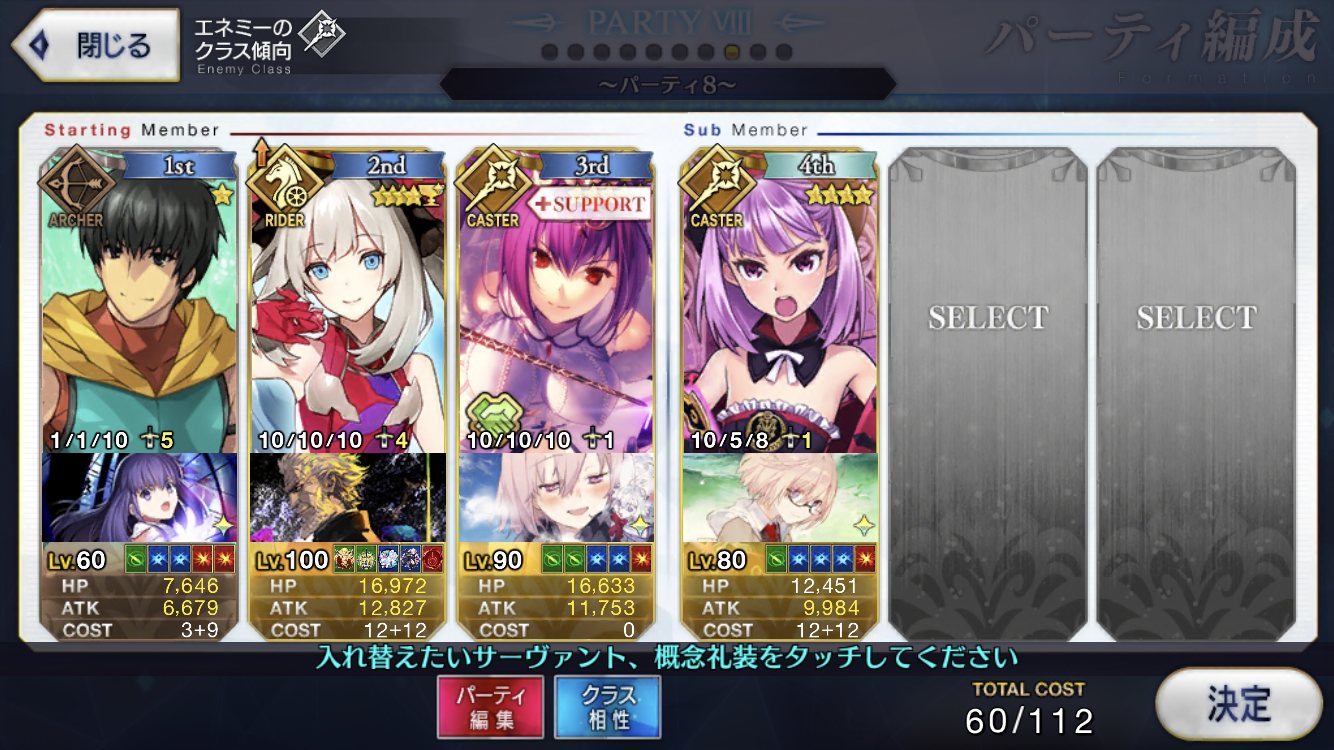 礼装はサポート特化の「欠片」、「理想の王聖」退場時に発動する「慈悲無き者」、「妄執」あとは…「マグダラの聖骸布」、「執行者」、「スイート・デイズ」なんかいいんじゃないかしら 知らないけど
