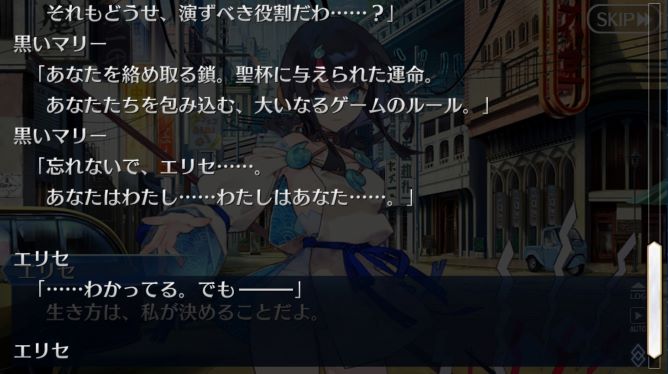 黒いマリーはゲームのルールを逸脱して「革命」を起こす。黒いマリーとの一体化は運命に追いつかれることを意味していて、エリセは自分の過去と向き合い遊戯界を壊すことでなく、生まれ変わることを選択する。『Fate/Requiem』の物語においての宇津見エリセの役割から解放されて、『FGO』という別世界でゲームでの役割を与えられたトークンではなく、カルデアで自由意志で行動するサーヴァントの一員になる。