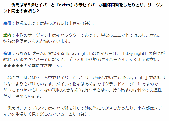 そういうとこやぞちなみにゲームに登場する『stay night』のセイバーは、『stay night』の物語が終わった後のセイバーではなくて、デフォルト状態のセイバーです。あくまで彼女は、●●●●●の英霊にすぎません。