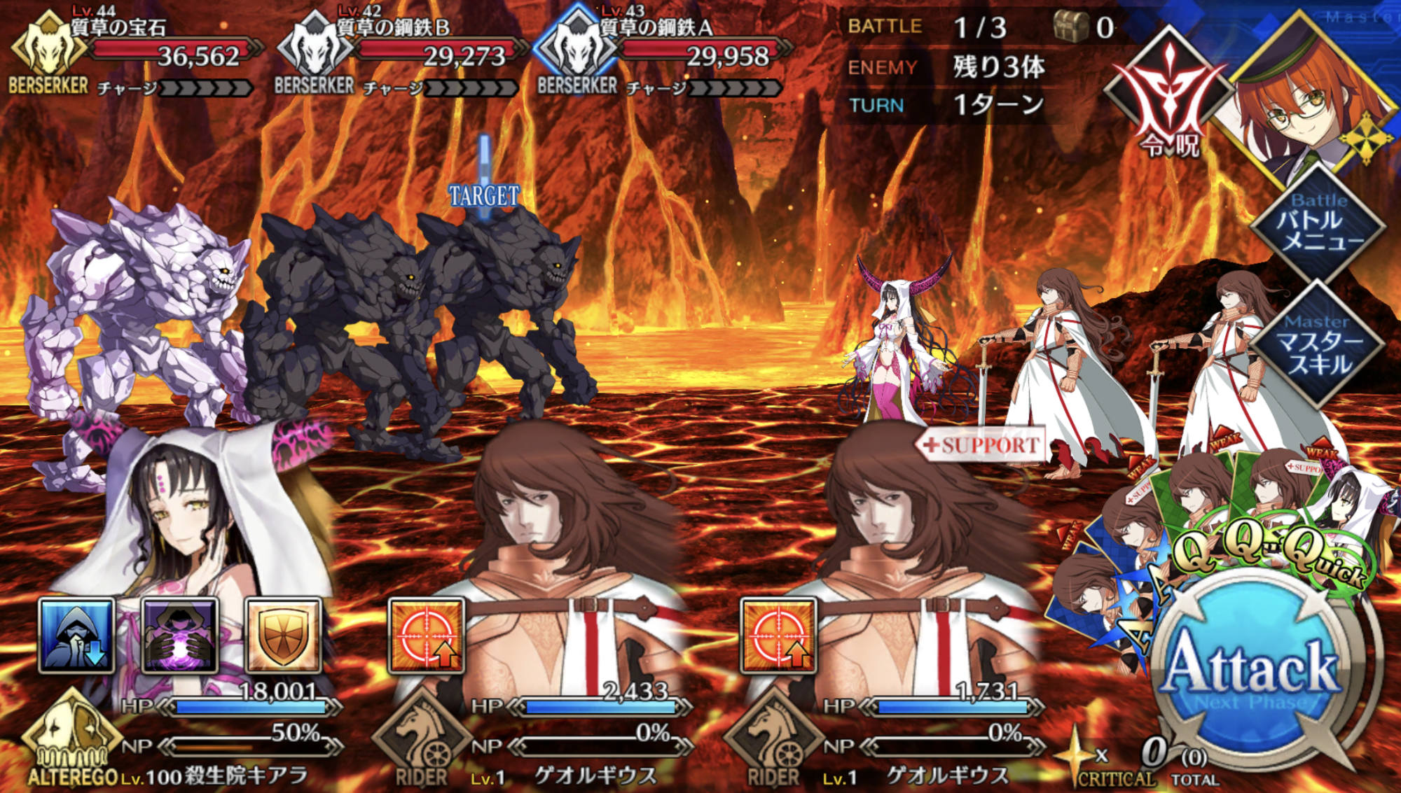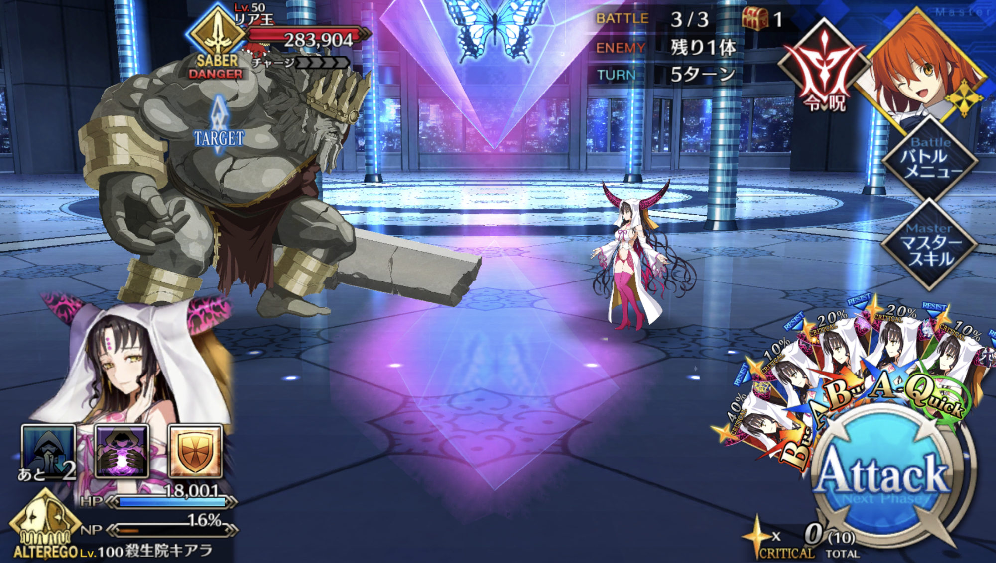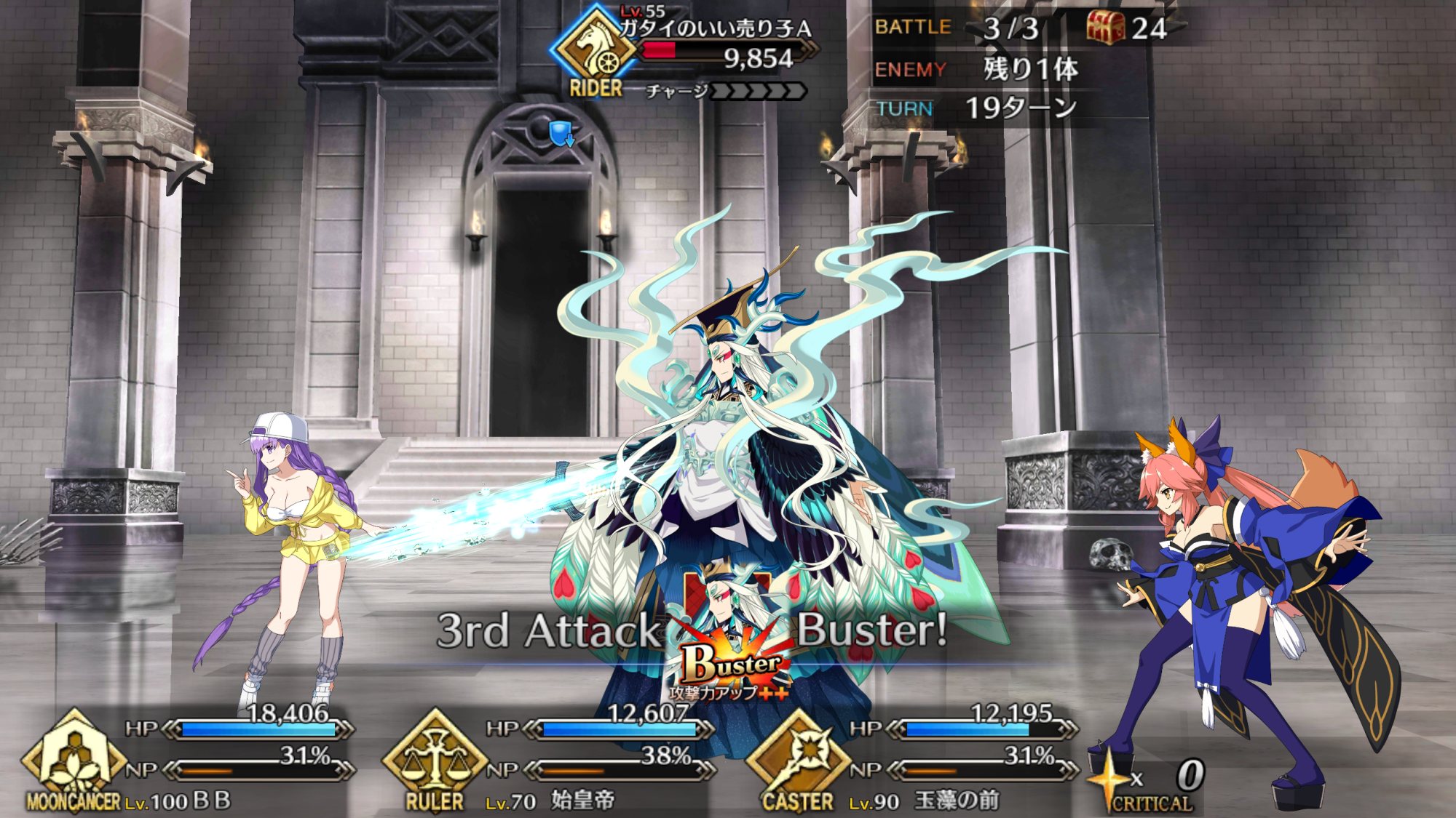 コンセプトは陛下の宝具を回し、味方を守りつつ陛下のクリティカルで殴ることだが、朕玉玉との違いはBBちゃんを加えたことでより攻撃寄りになり、玉藻で殴りきれない場合にも対応できるようになっている点だ。