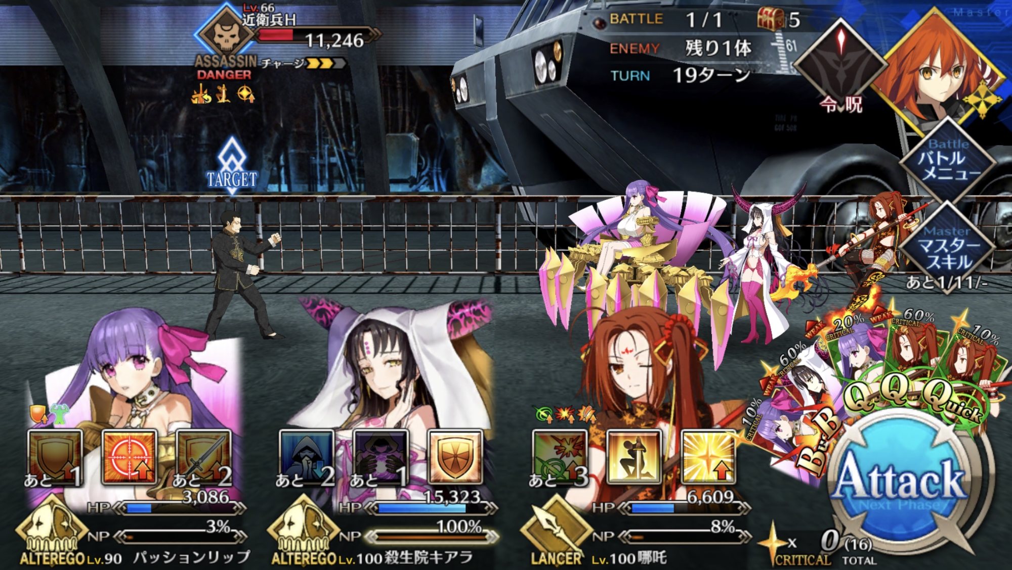 基本的な動きはAチェインで陛下と玉藻のNPを優先的に貯め、二人の宝具を回して攻め、これをBBちゃんの無貌の月で補助する形になる。さっさと処理したい敵はBBちゃんを瞬間的にアタッカー化して排除しよう。BBちゃんはNP50チャージできるので、この運用ではNPをあまり貯めなくても問題ない。50くらいは欲しいけどAチェインに混ざったり玉藻の宝具で貯まる。もう一つの特徴として、3人ともチャージ減を持つので、宝具遅延力も高い。