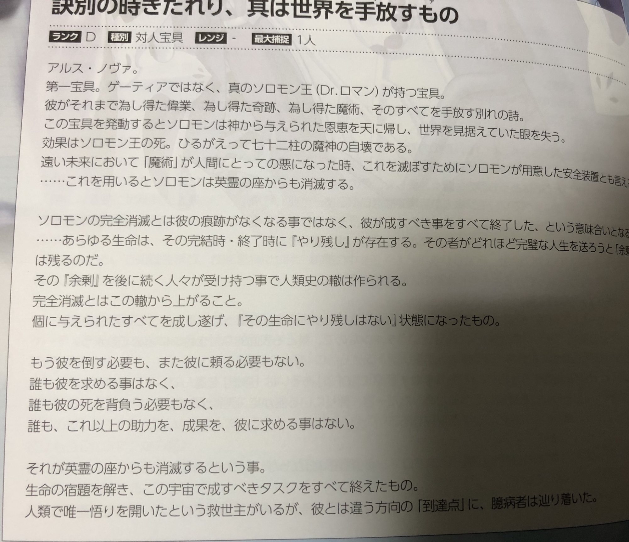 全部使うってすごいな、自分はいざというときのために温存しちゃうわ己の姿や功績が二度と地上に現れない以上、英霊の座からも消滅し、ソロモン王の痕跡は世界や人類史から全て消え去り、人類では誰も到達していない終わり、本当の意味での「無」に至る。