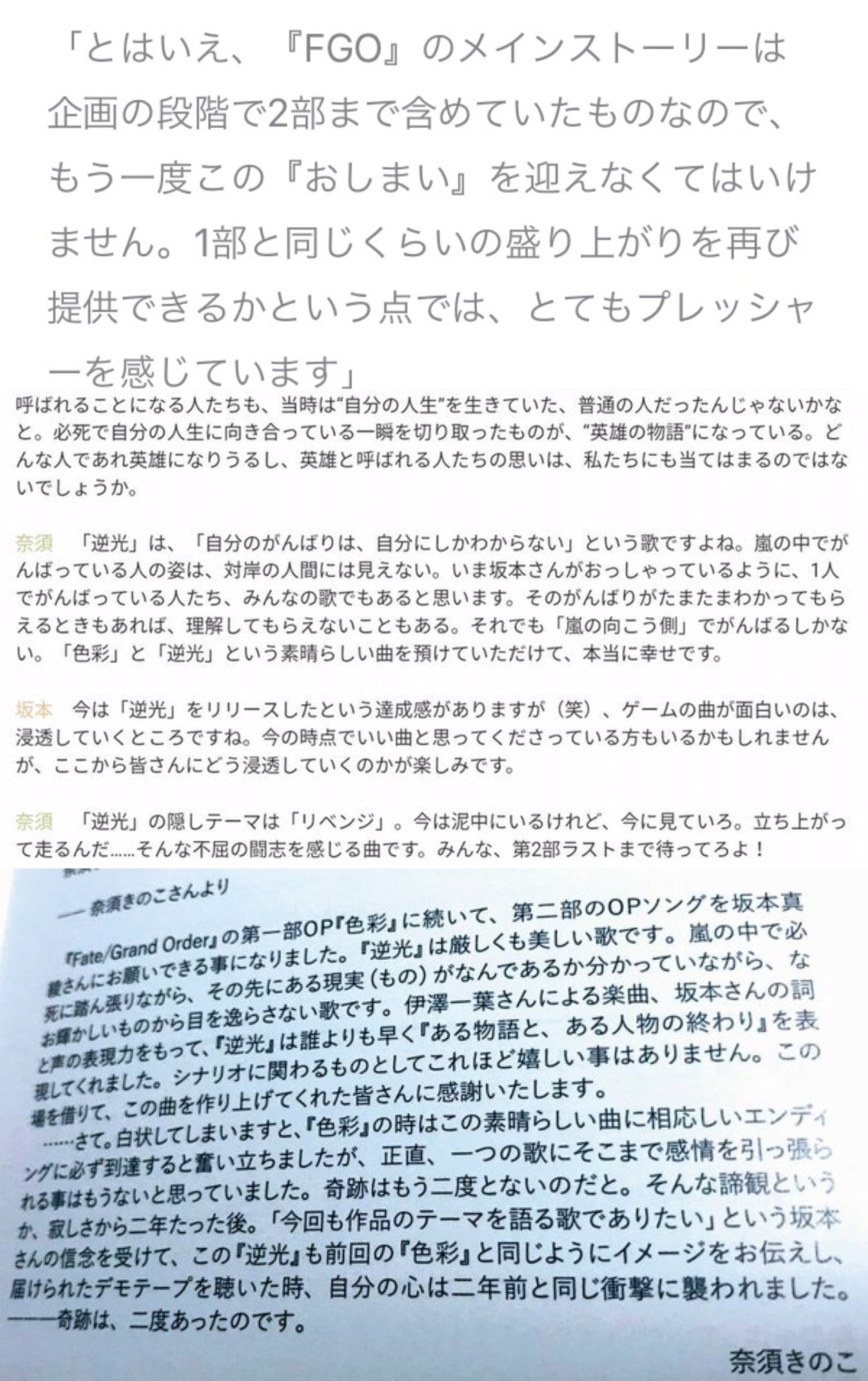 そもそも型月でこう、自己投影する事自体向いてない気がする。俺達はあくまで物語の『観測者』なんだ。キャラクター達の出来事、世界、言葉を第三者の目から覗き見て、神々(きのこ含むライターさん達)から弄ばれてる存在。でもそれで良かったと思うよ。本当の意味で一般人な俺達は、あの物語のなかじゃ『名の無い誰か』にしかなれないんだから