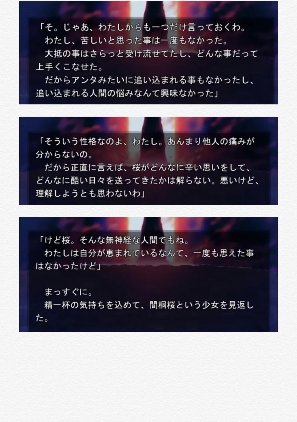 でも、「普通の女性だったら」なんて自分には考えも及ばなかったから、あなたの感想を聞いて、桜が自分をどう思っているか、そんな自分を士郎が受け入れてくれたことがどれだけ嬉しかったかとかにより感情移入できそう。ついさっき見終わったが…