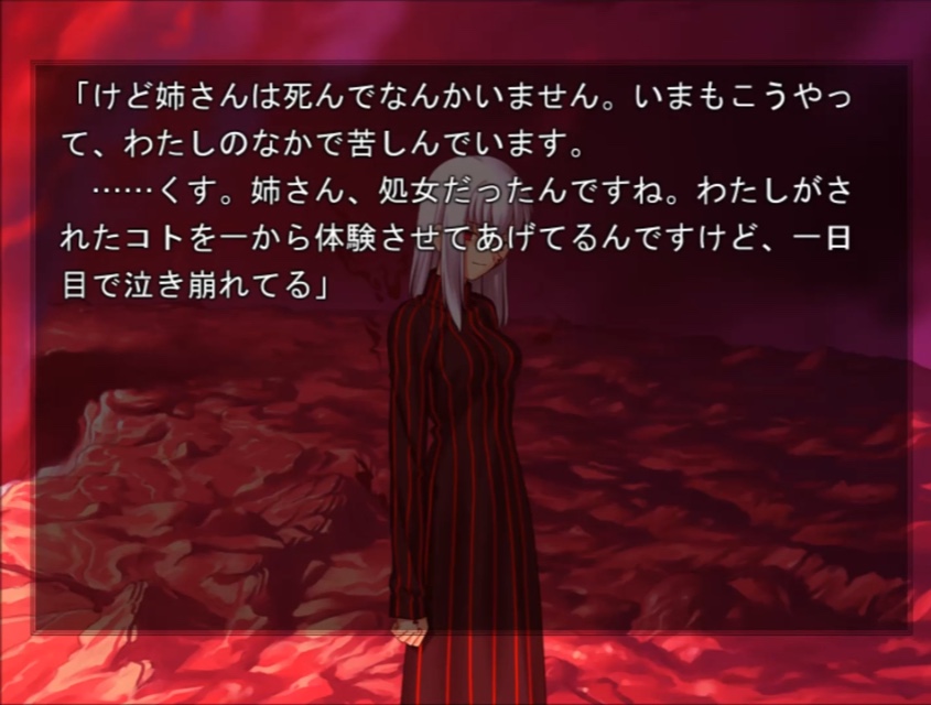 決壊直前の慎二とのやり取りを聞くだけで、桜は幼少期から日常的に慎二とヤッてたっぽいけど、その間は心を凍らせてやり過ごしていた風の物言いだった=不本意ながら男に下着姿を見せ慣れてしまっている事が伺える。