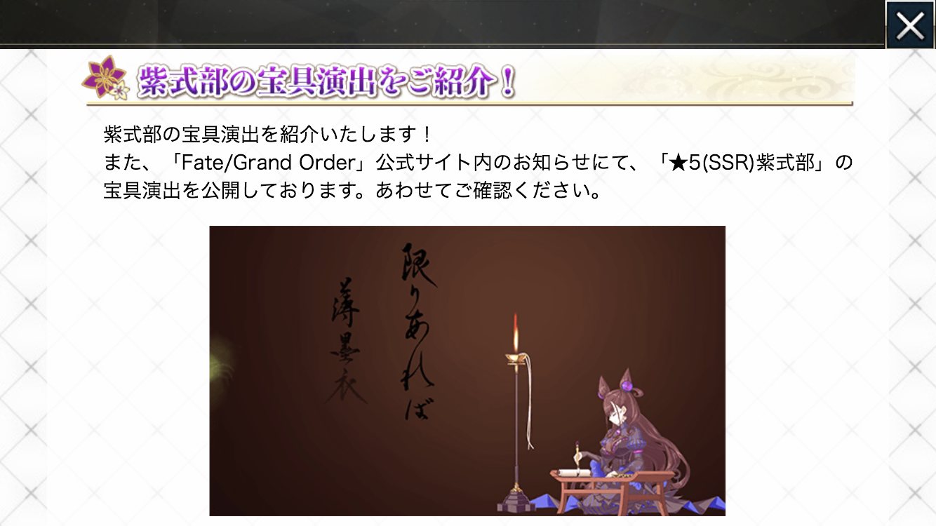 あ、色んな所で異常性癖バラされてる作家だ。紫式部ゴスロリかー…まぁキャスター一通り居るし今回見送っても…→宝具演出の十二単可愛いな、よし引くわ