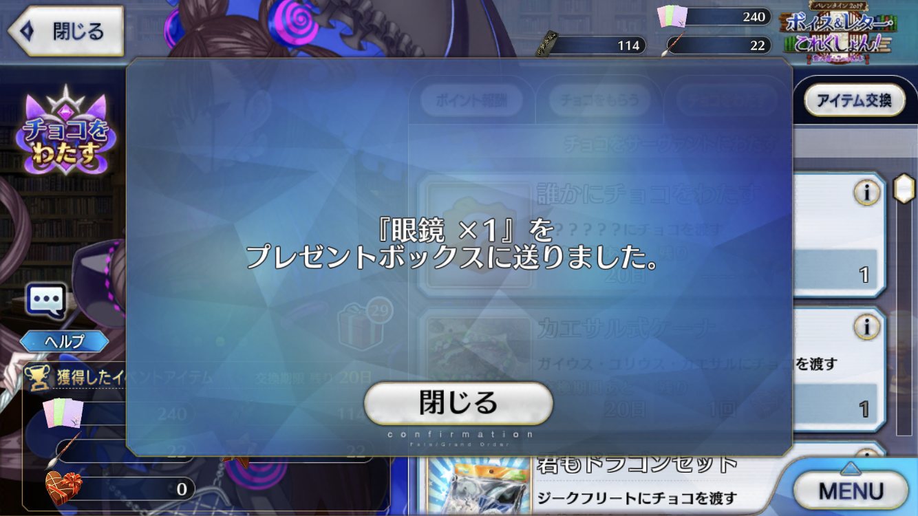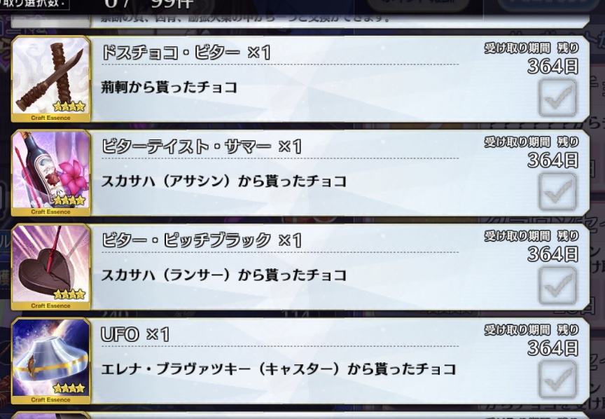 うん。普通だよ普通。バレンタイン礼装は入手日を2/14で揃えたいんだけど、貰った礼装ってプレボに送られましたっけ?