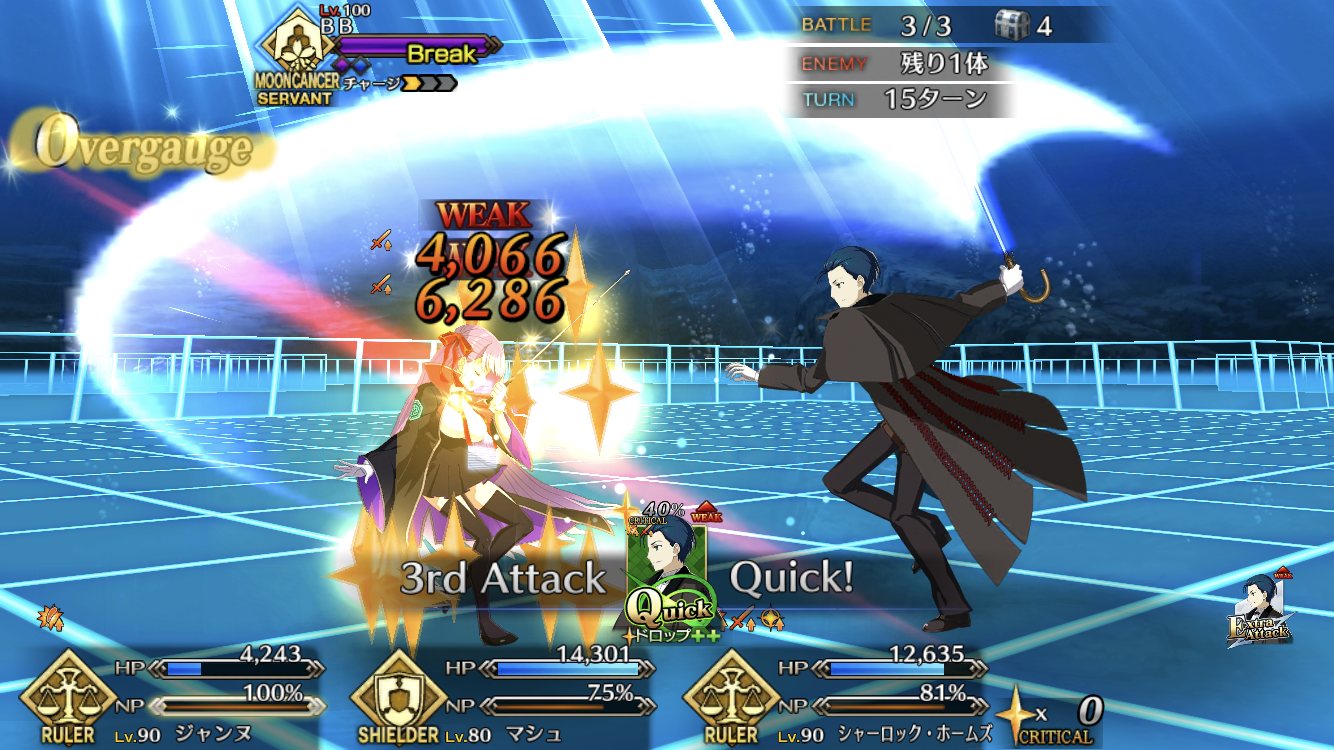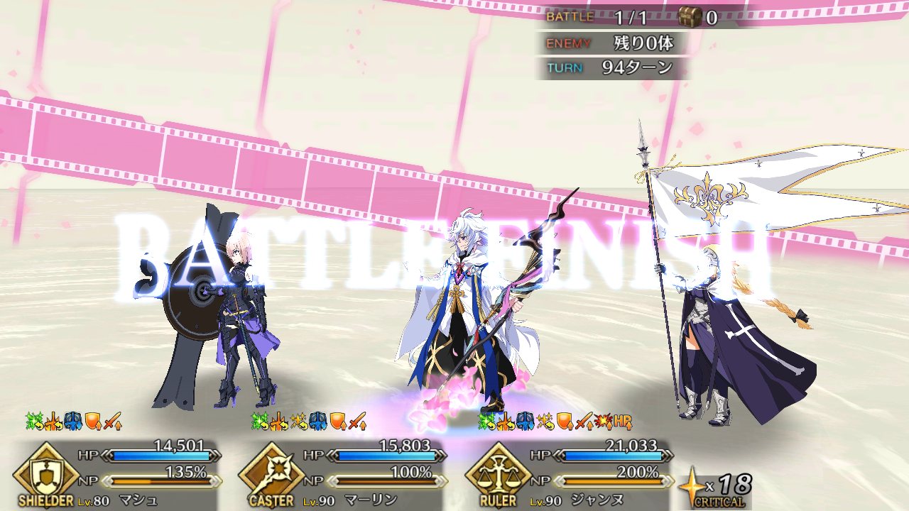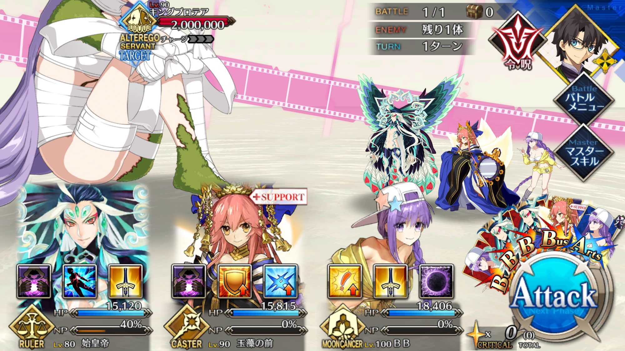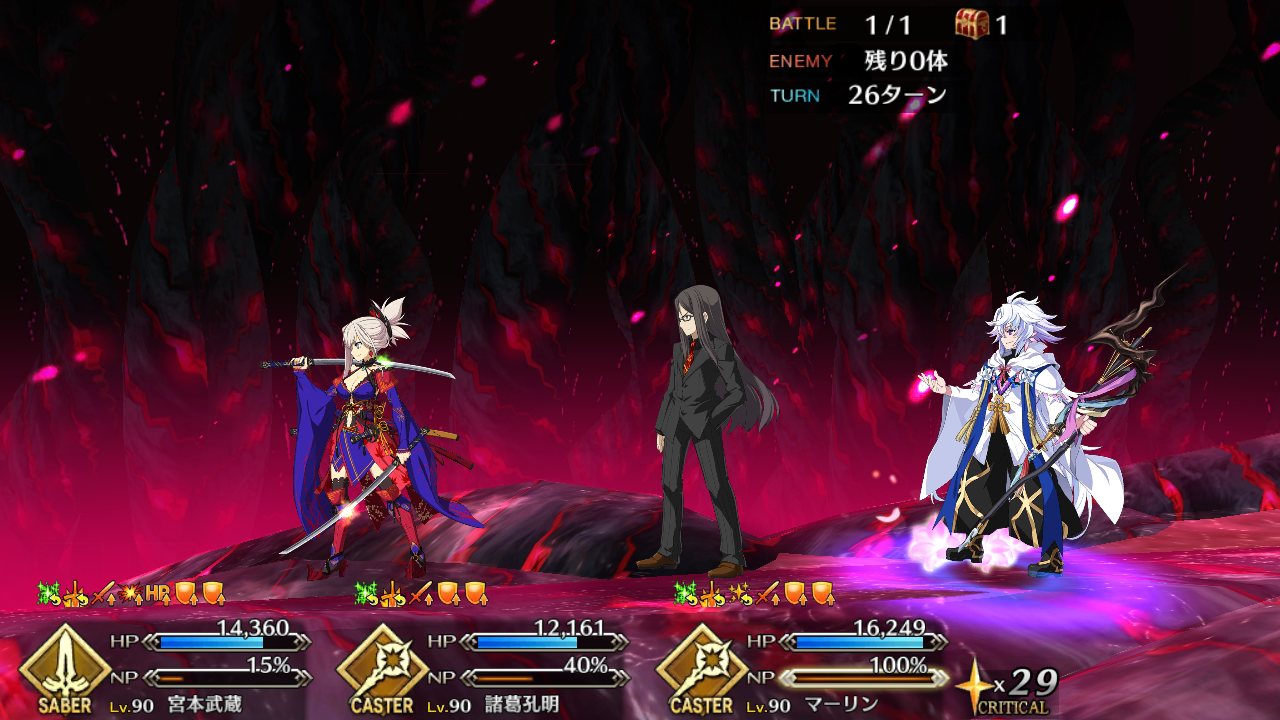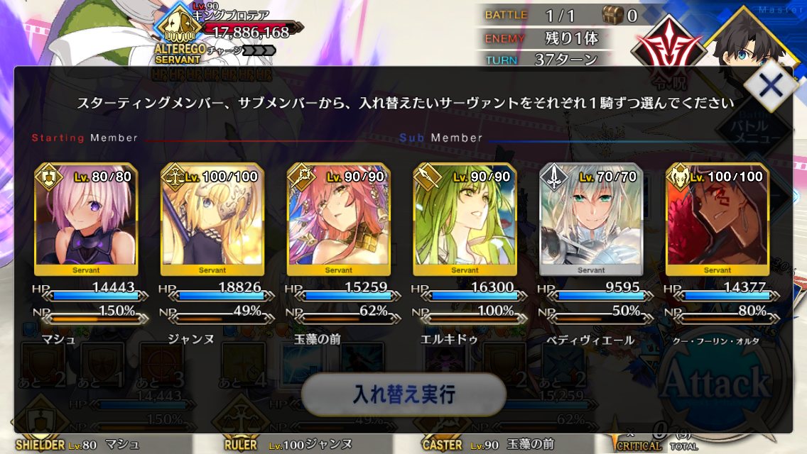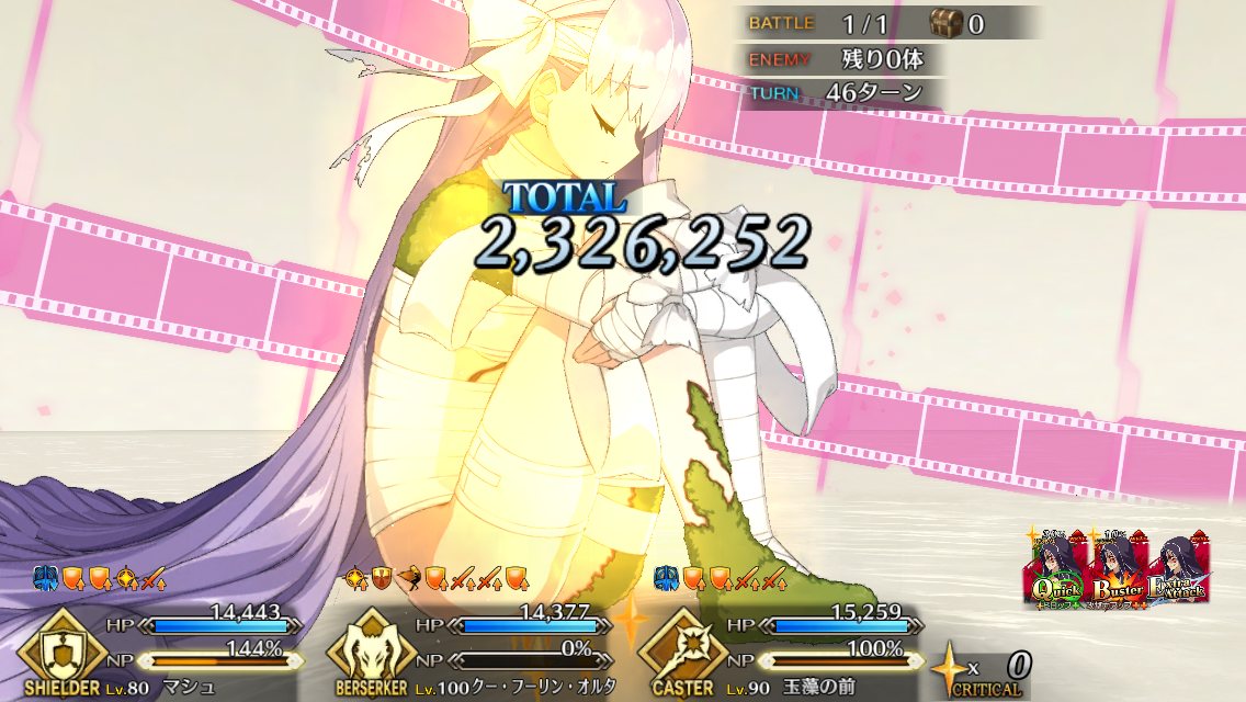 2度目はBBちゃん、玉藻、ルーラージャンヌのスタメンで行ってみたものの、回復量を激減されている最序盤にBBちゃんとジャンヌ両方がクリティカルをくらって瀕死になり、その後ジャンヌが落ちて戦線瓦解したので撤退。