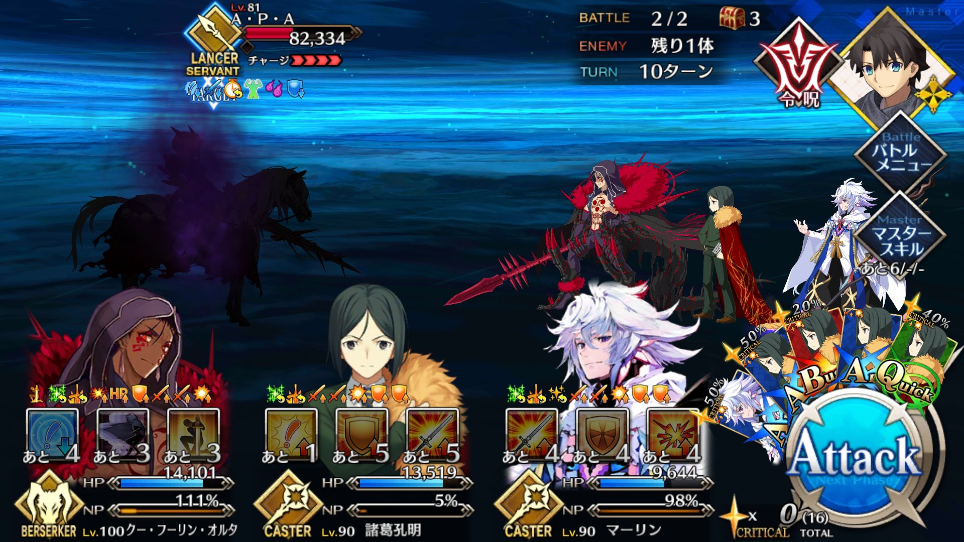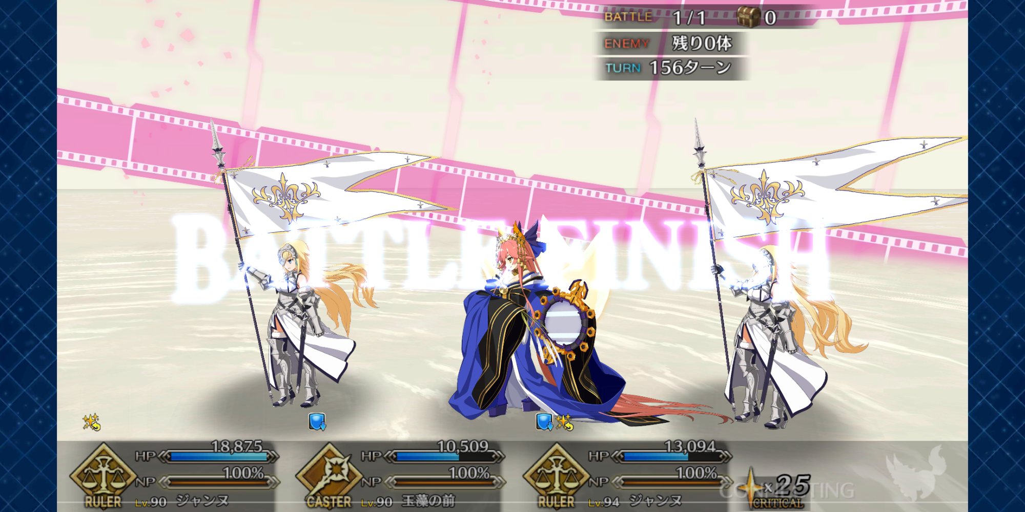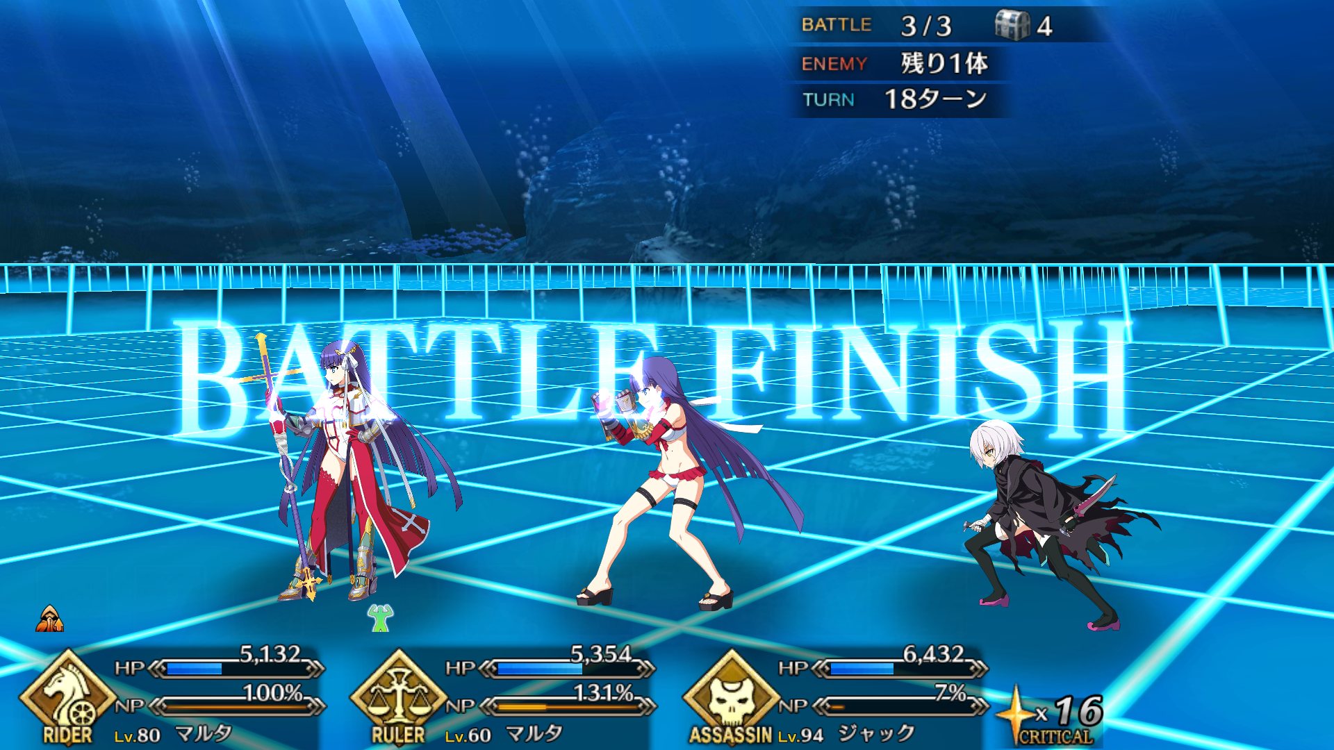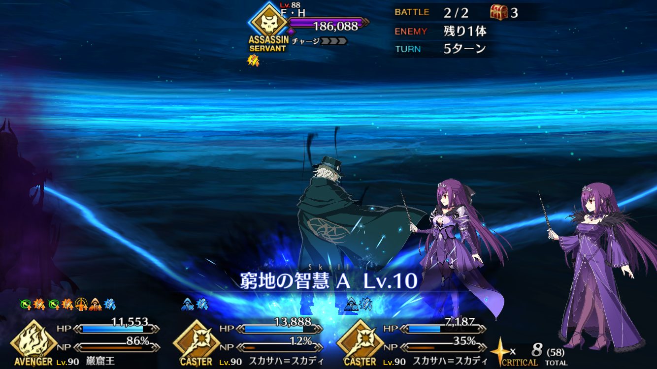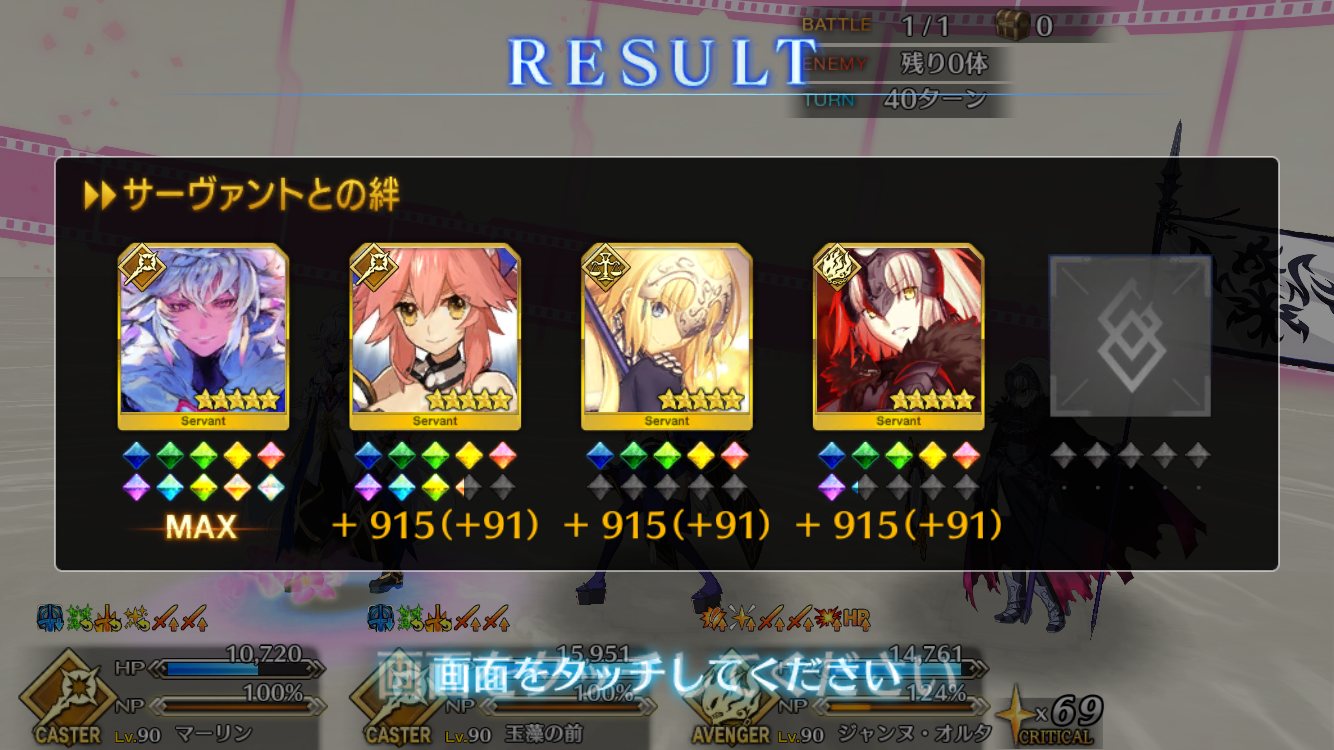 2度目はBBちゃん、玉藻、ルーラージャンヌのスタメンで行ってみたものの、回復量を激減されている最序盤にBBちゃんとジャンヌ両方がクリティカルをくらって瀕死になり、その後ジャンヌが落ちて戦線瓦解したので撤退。
