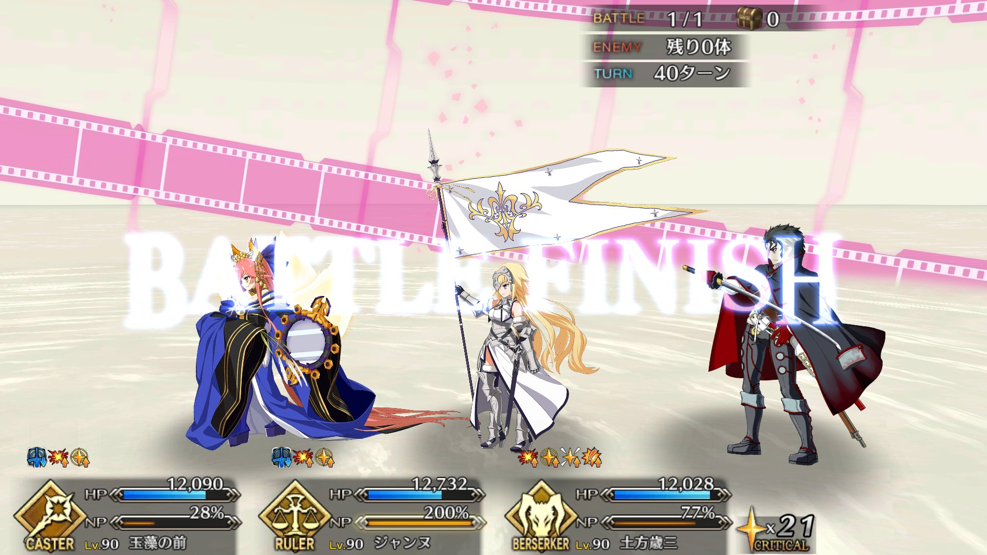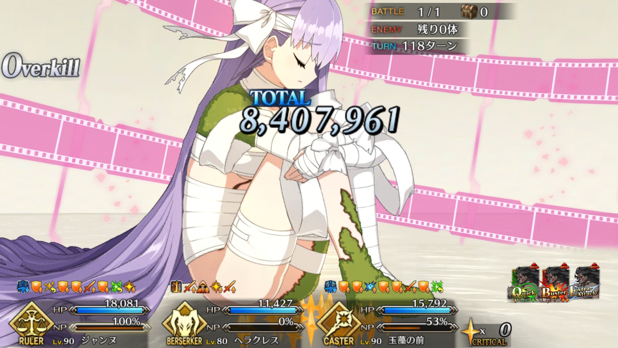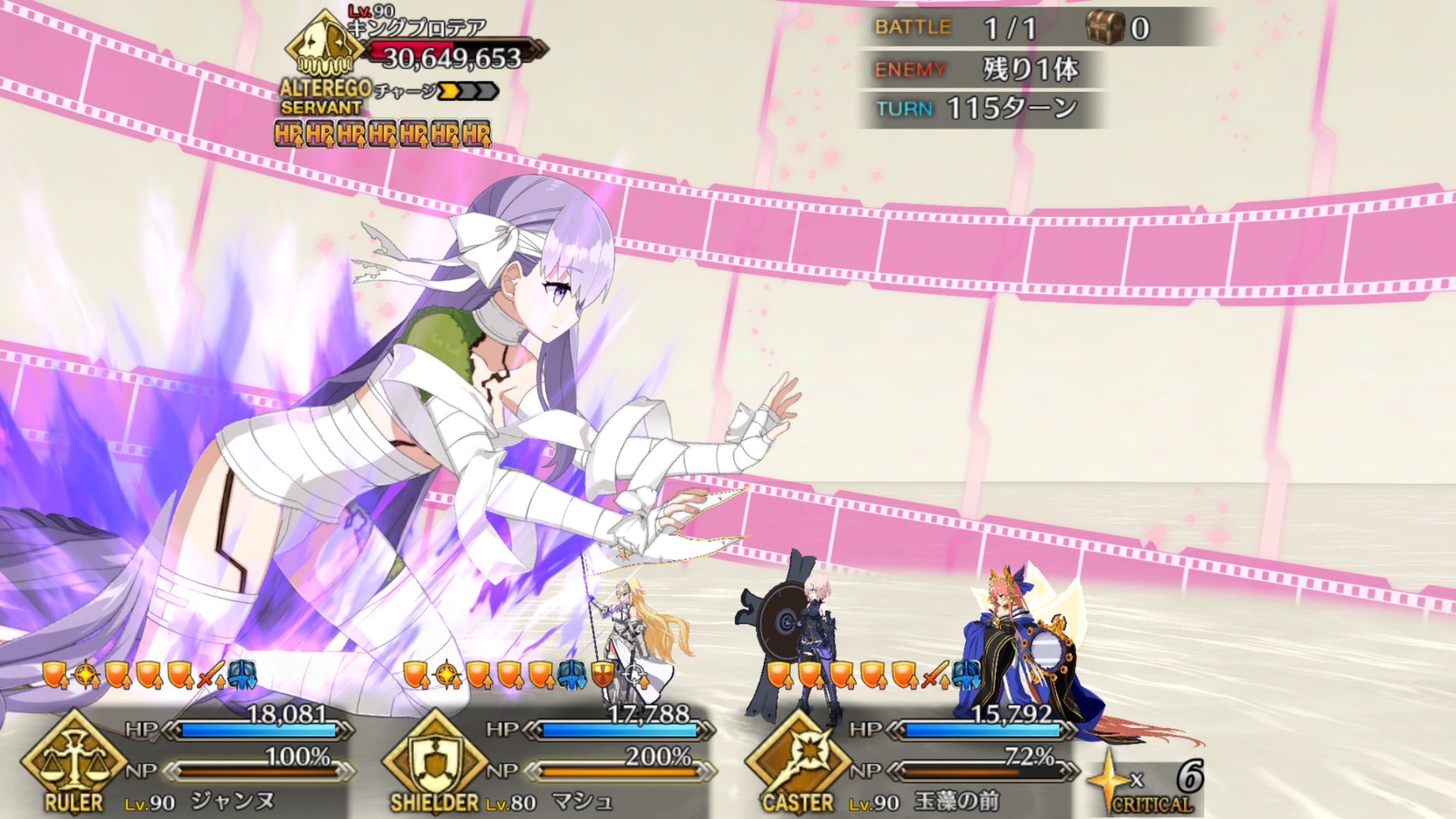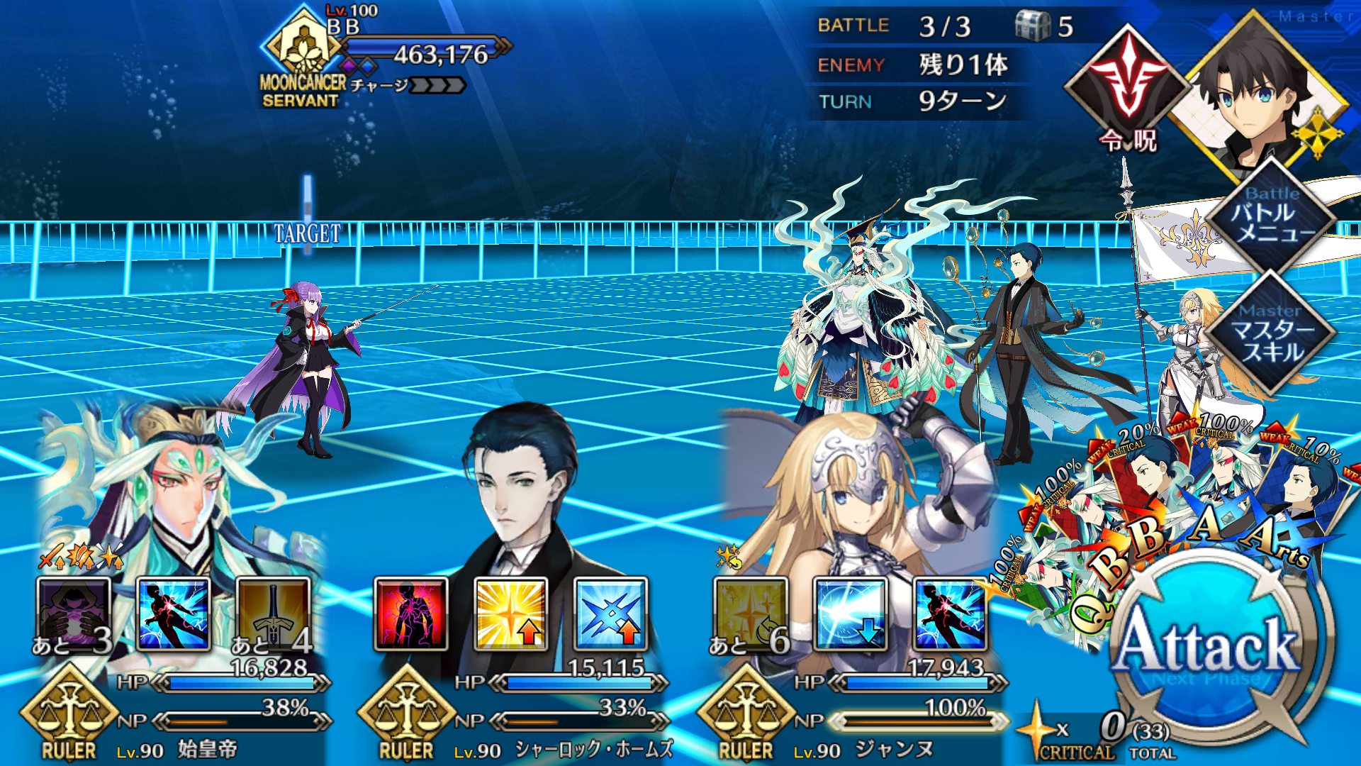 2度目はBBちゃん、玉藻、ルーラージャンヌのスタメンで行ってみたものの、回復量を激減されている最序盤にBBちゃんとジャンヌ両方がクリティカルをくらって瀕死になり、その後ジャンヌが落ちて戦線瓦解したので撤退。