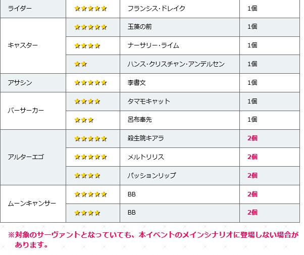 それに加えて、ガチャで排出されるメルトリリスとパッションリップはライダー・アサシン・キャスターの3クラスに攻撃有利(被ダメは等倍)なので、クラス補正でATKがマイナスされて表記上のATKよりダメージが低くなりがちなアサシン・キャスターよりも安定するし、数は少ないながらフォーリナークラスに完全有利を取れる唯一のクラスなので、少なくとも今イベントは可能な限り完全クリアを目指してBBちゃんの宝具5を目指し、リアルマネーに余裕があるならガチャも回してリップかメルトのどちらかを入手しておくとメインストーリーの攻略が楽になると思う。>>76