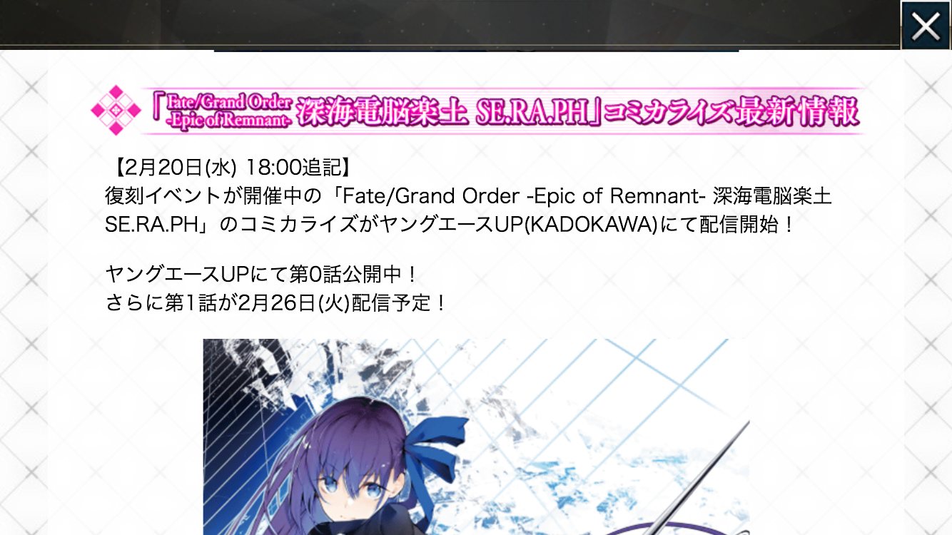 復刻版Fate/EXTRA CCC×Fate/Grand Order コラボイベント「深海電脳楽土SE.RA.PH」の専用スレッドです。