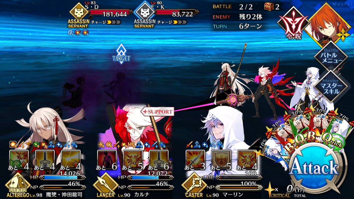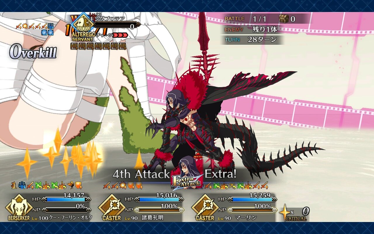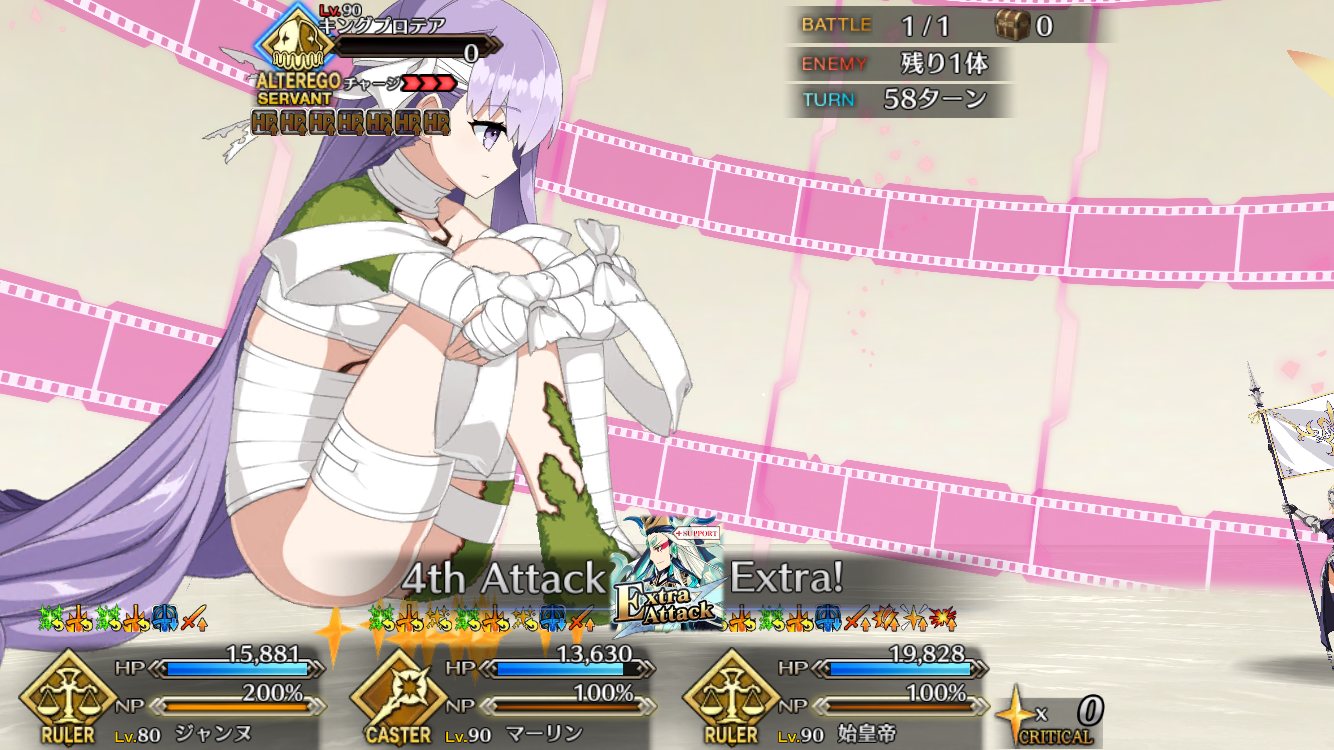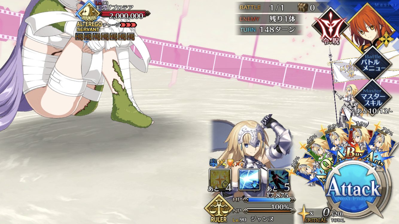 ネロのほうも、最初期あるあるもう一人の自分が「6番目の…」とか言ったりしますけどねプロテアちゃんのところまで辿り着いたので2回ほどチャレンジしてみたものの、1度目は攻略サイトに載っていた編成を丸コピーして突撃。令呪コンティニュー使って20ターンの耐久に成功したものの、キャッシュクリア時のカード運に恵まれず撤退。