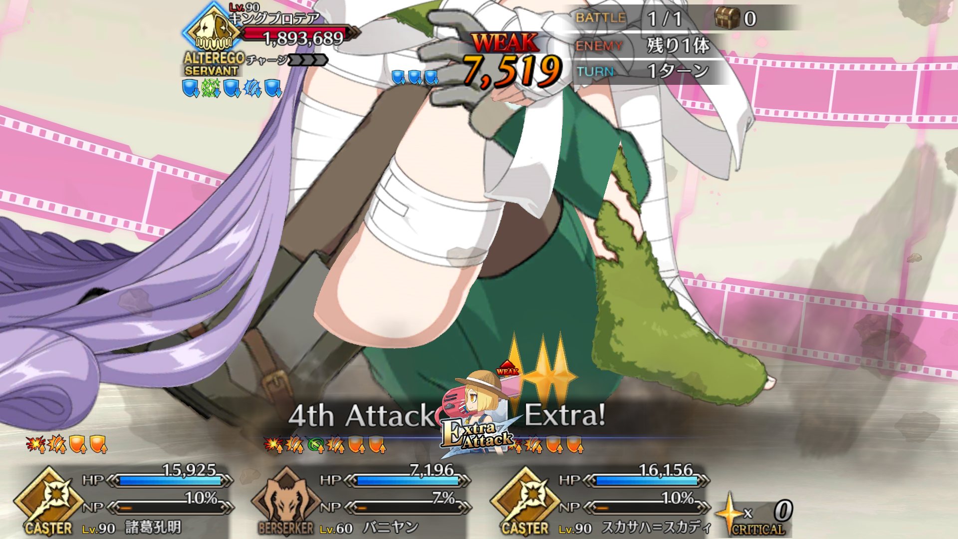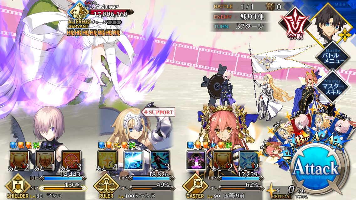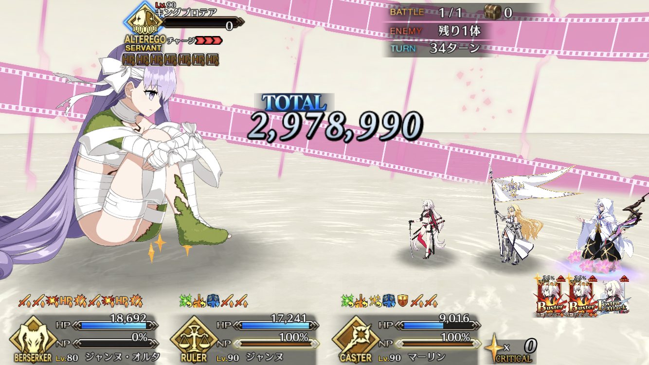 あんまりプロテア戦にかまけてるとチップやミッション攻略が滞ってしまうな・・・。キングプロテア戦、ジャンヌ、マシュ、デオンで耐久してたんだけど、パターン入ったらガチガチで耐えるもんだからなんか楽しくなってきて、倒すのそっちのけで何ターンピンピンしてんだろってひたすら耐久してた(笑) 数十ターン経過してもまったく危うさなくて、そろそろいっかとバフ盛っておいたスカサハ師匠でとどめ。いやあ、楽しかった!
