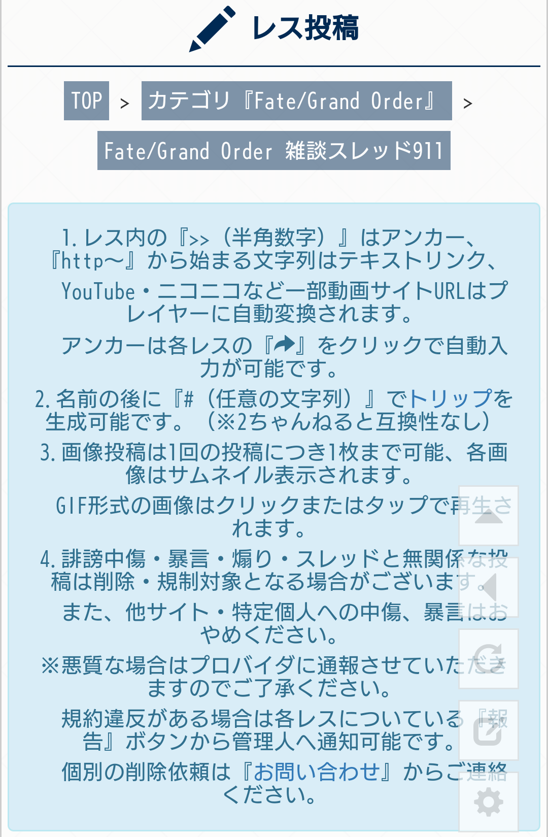 リーク・解析情報等は禁止です!荒らし・誹謗中傷等は無視し、報告・NGにて対応してください。煽りや荒らしは完全無視が最も効果的です。反応するあなたも同類です。他所への内輪ネタの持ち出しは控えましょう。二次創作物の無断転載禁止、公式関係者のイラストや転載が許可されているものに関しては必ずリンク先を併記してください。最終再臨や霊衣解放のイラスト、最新シナリオ内の画像や話題などは配信、実装から2週間は控えてください。