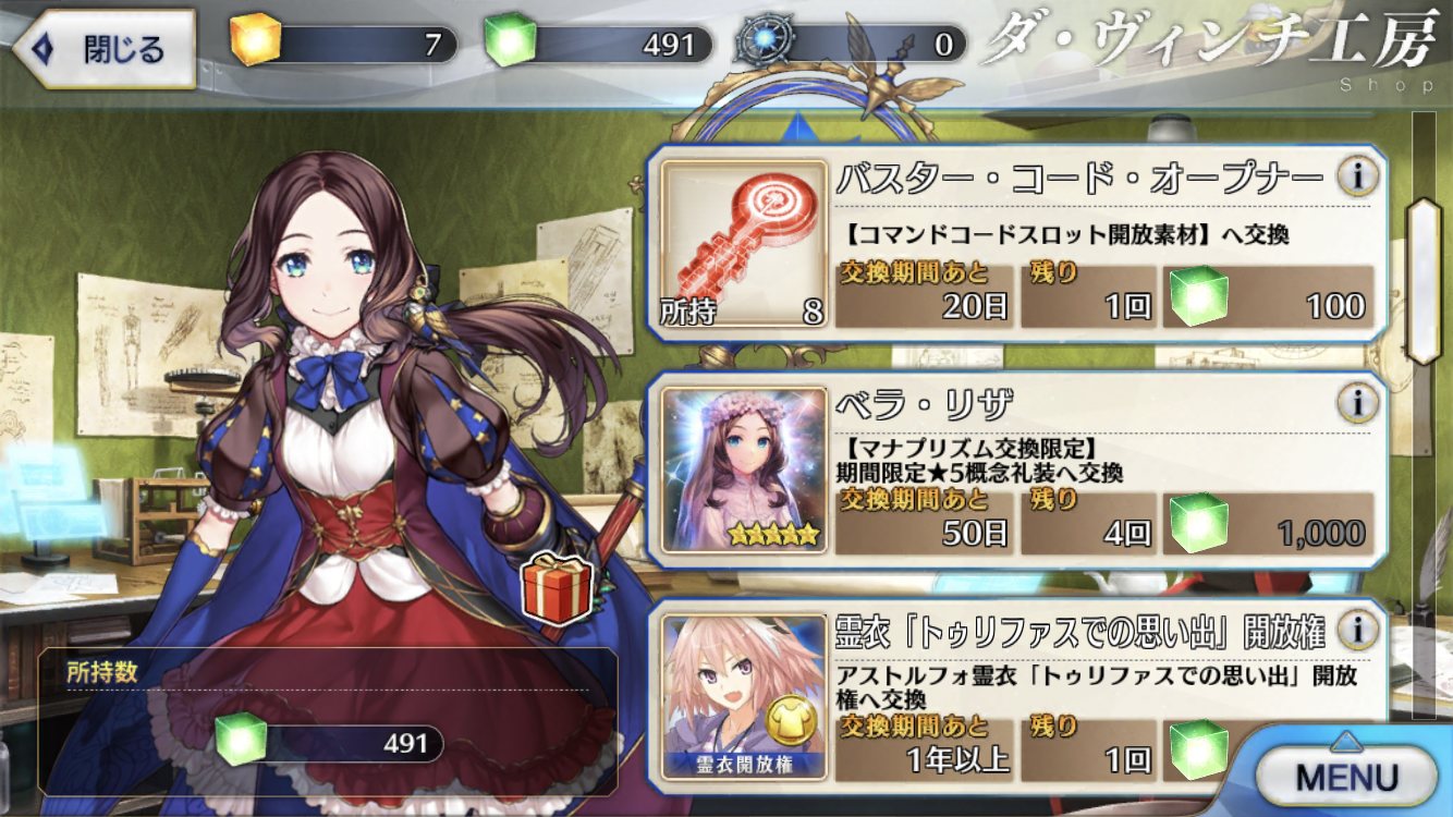 キャメロット攻略中、ショップに居るホログラム ダ・ヴィンチちゃんを見たときの悲壮感は異常第二部完結記念で10k課金すれば限定星5、1体配布とかああれば嬉しい