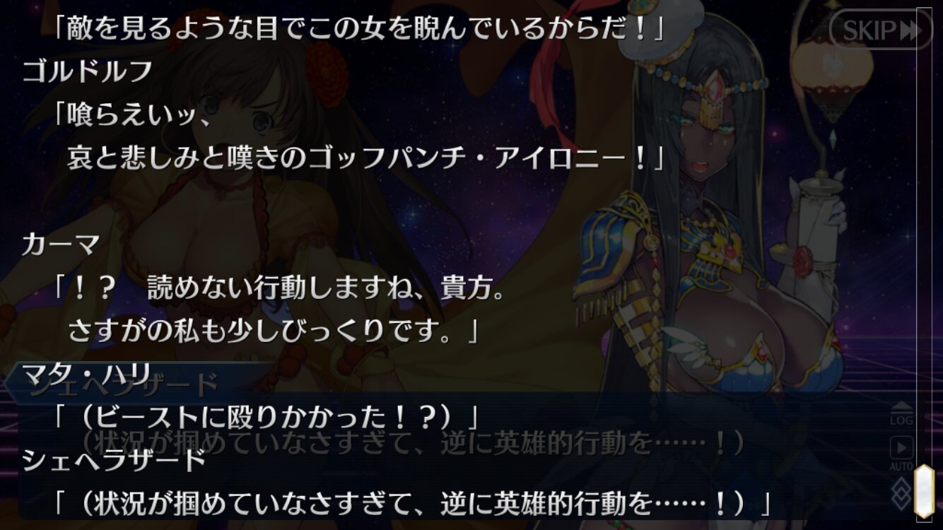 イバラギンとチャンネル争いするシェヘラザードという構図が思い浮かんだカレスコ凸れてない上、オダチェンも魔術礼装のNPアップも使えないから、地味にスカスカシステムが封殺されてるのが応える・・・