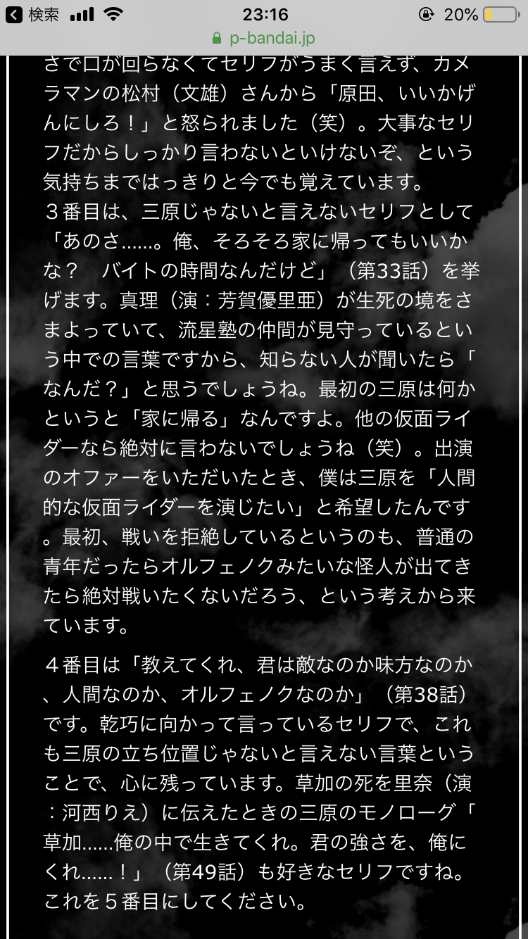 檀黎斗→五代雄介に渾身の暴力を振るわれた男、津上翔一に未来を奪われた男、城戸真司に背後から鉄パイプで殴られた男、乾巧に夢を奪われた男、剣崎一真に自分の作った世界を破壊された男、紅渡にライフエナジーを吸い取られた男、門矢士が綺麗に撮った男、火野映司が手を伸ばさなかった男、如月弦太朗が友達にならなかった男、操真晴人に絶望させられた男、葛葉紘汰が許さなかった男、天空寺タケルに死.ねと言われた男、宝生永夢の人生を手のひらで転がした男、桐生戦兎に殺.された男、常磐ソウゴの偉大なる肥やしとなった男>>980
