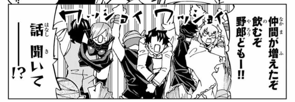 主人公とその仲間みたいなキャラ達が仲良くほんわかしてるシーン。でも過酷なバトルもので皆があつまって幸せそうな顔してるああいうシーンってごくわずかで貴重なんだよね…