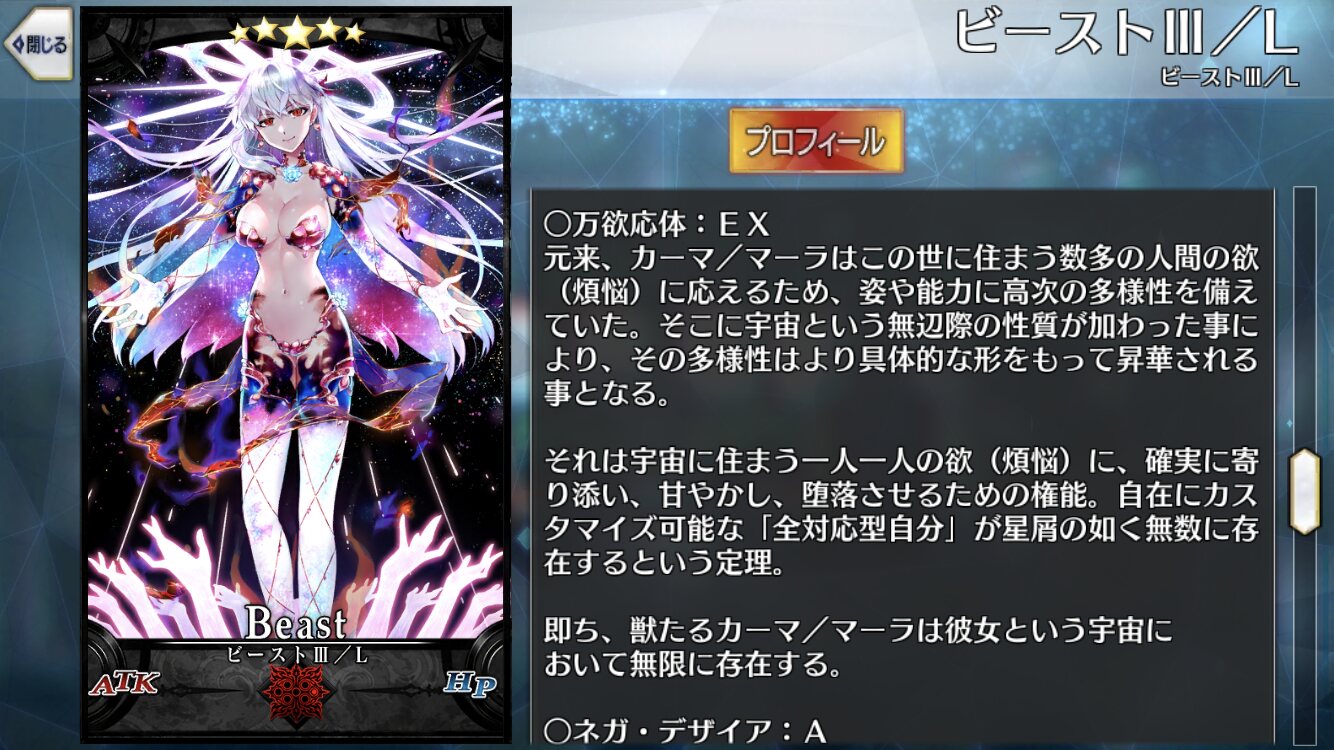 ええ、私事でもありますがね!飽きたなんていってグレイスキルマチャンス逃した阿呆ですよ私は!カーマが素材で誘惑してきたらすぐ堕ちる自信あるわ。各ビーストのやろうとしたことって控えめに見てもMARVELレベルだよね