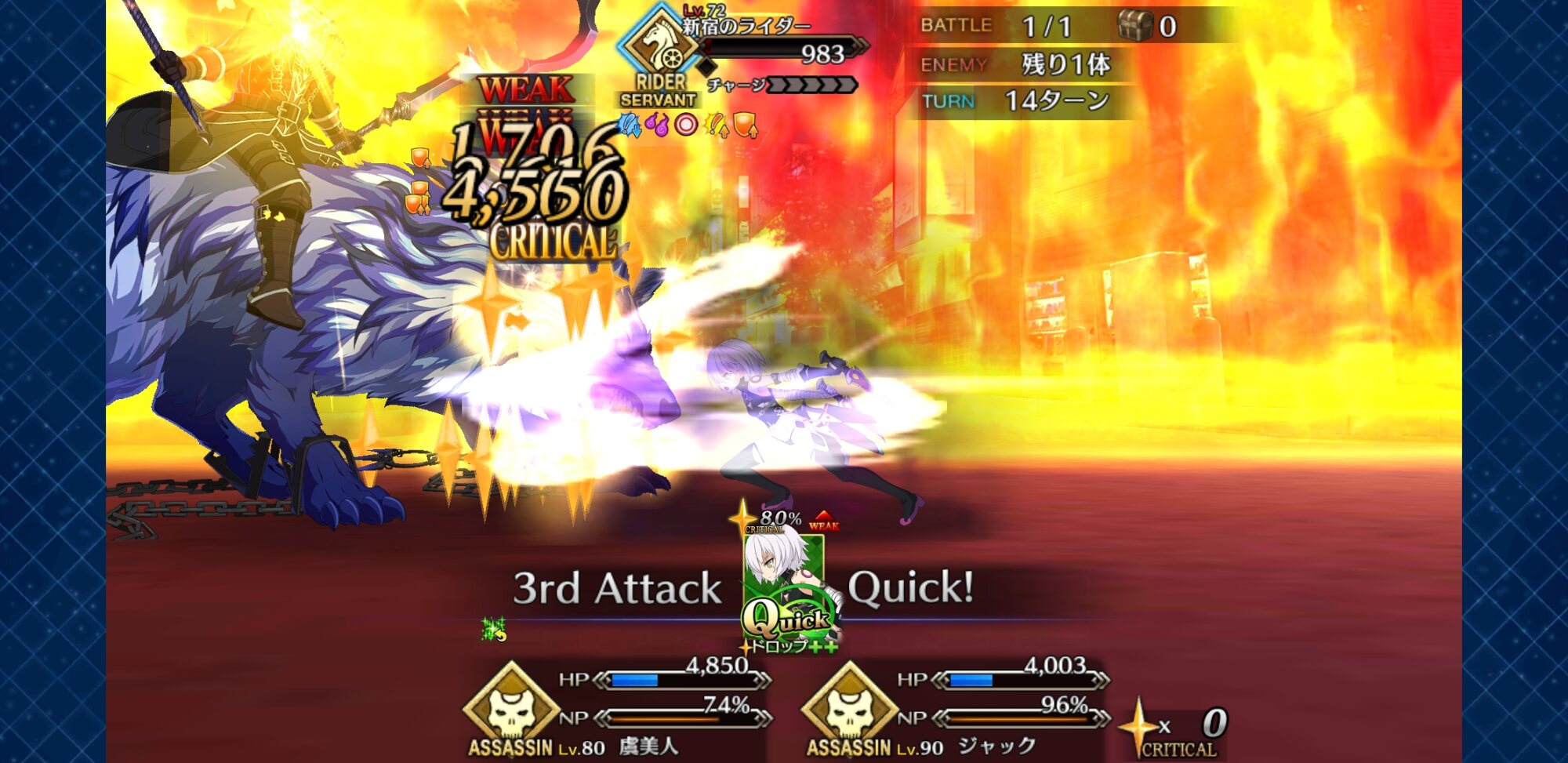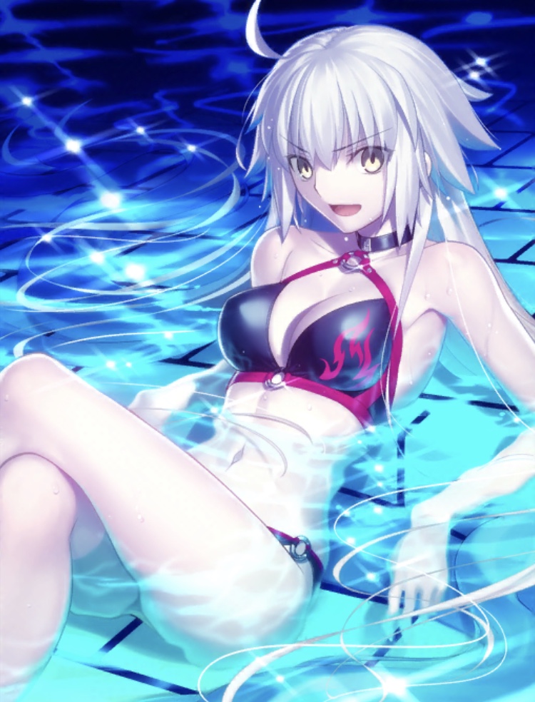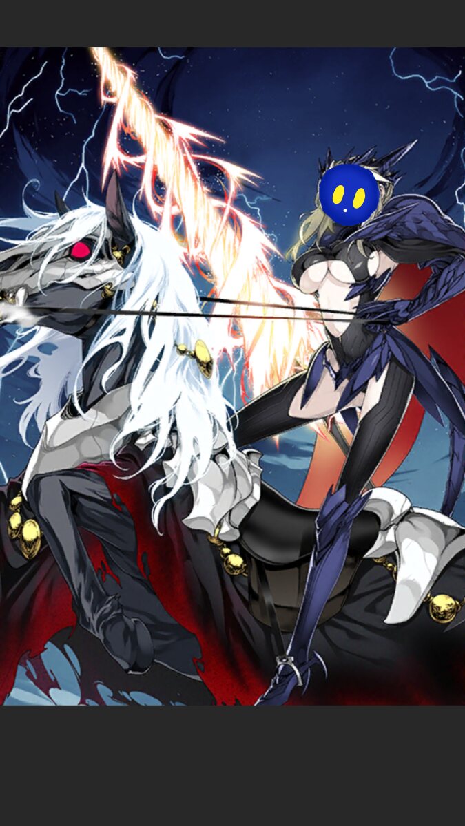 「トリの技を真似てみた」と自分の身体を流体化させて高速噴射するウォーターカッターで三次元攻撃してくるメルトリリスに対して、ジャンヌ譲りの耐久力で耐えながら、憎悪の旗に魔力を込める邪ンヌ。