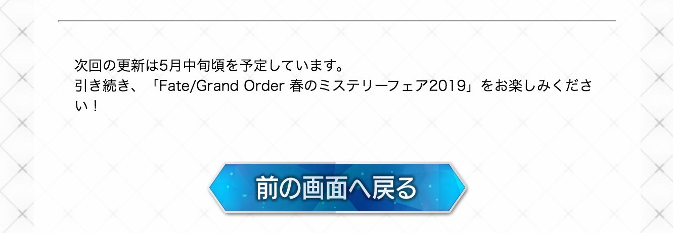 2019年5月15日(水) 18:00(予定)~5月29日(水) 12:59まで