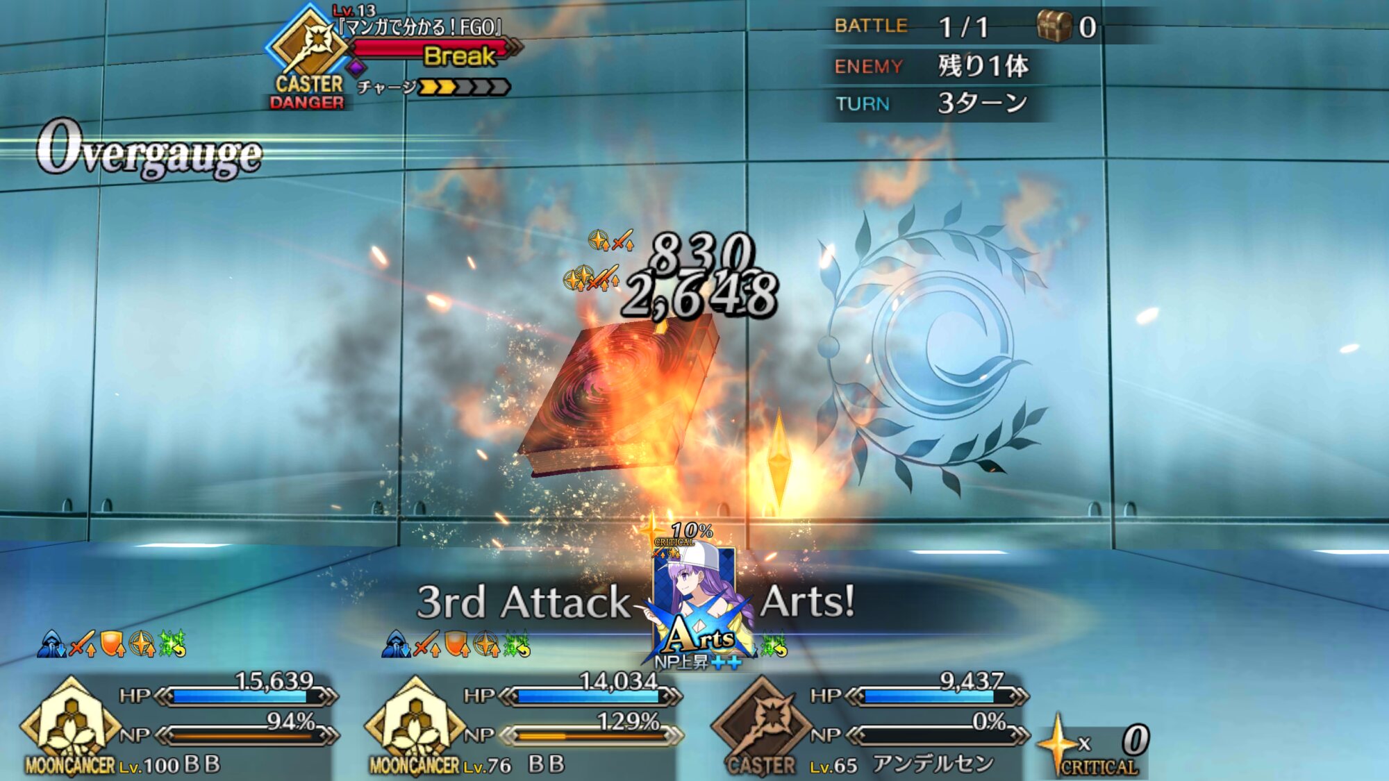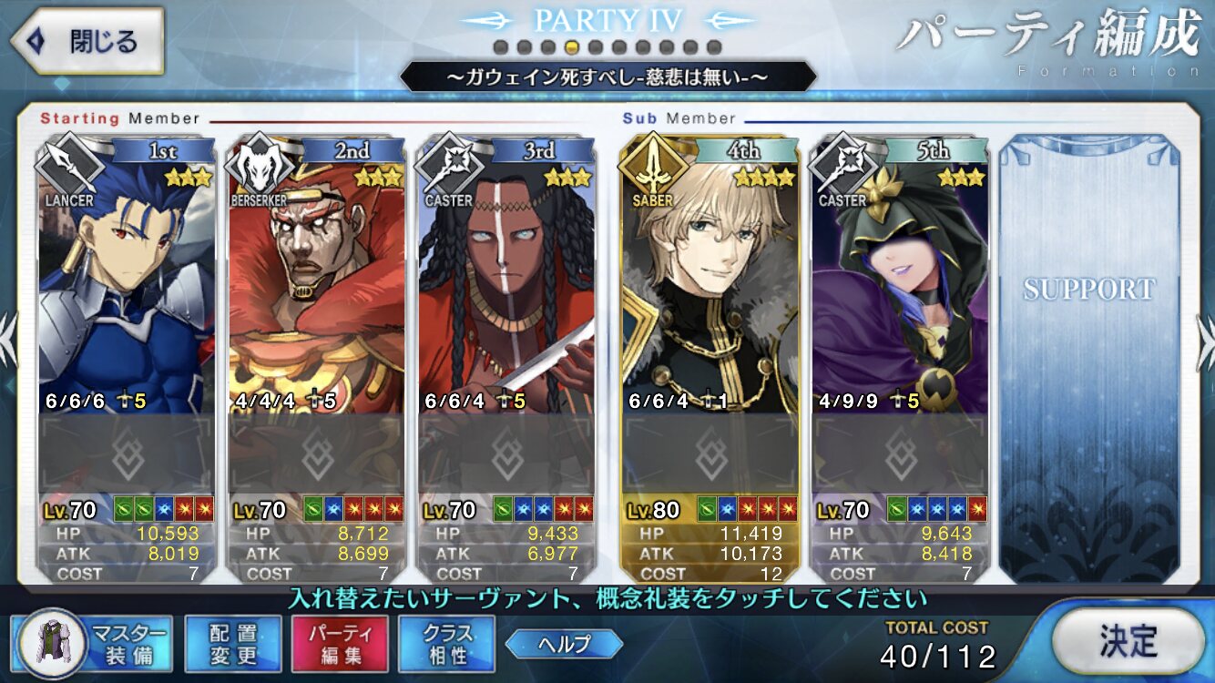 タゲ集中がパーティー中三枚、無敵回避も三枚なので、ダメージ分散を行いつつチャージ3単体宝具も封殺可能。最終手段として一応全員に無敵回避貼れるけど、CTの都合上本当の最終手段。
