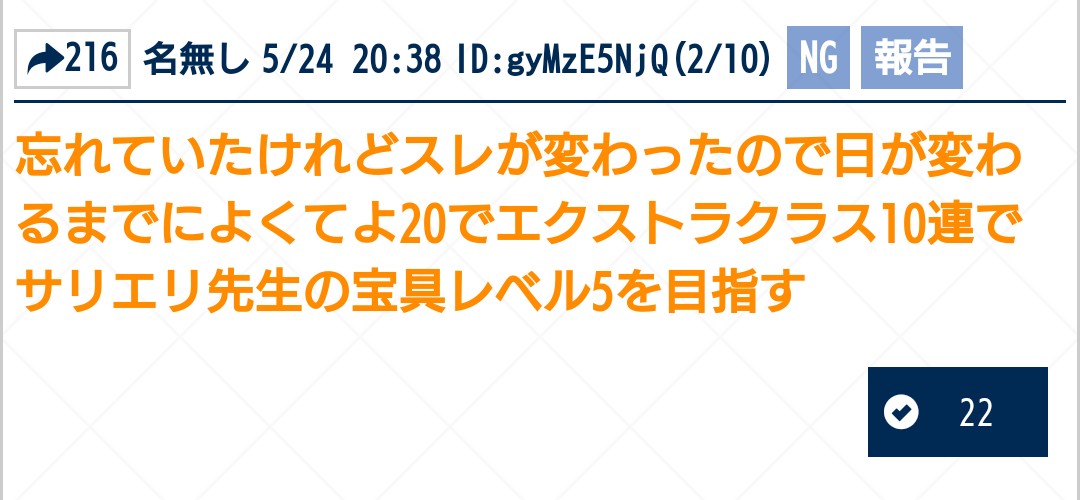 リーク・解析情報等は禁止です!荒らし・誹謗中傷等は無視し、報告・NGにて対応してください。煽りや荒らしは完全無視が最も効果的です。反応するあなたも同類です。他所への内輪ネタの持ち出しは控えましょう。二次創作物の無断転載禁止、公式関係者のイラストや転載が許可されているものに関しては必ずリンク先を併記してください。最終再臨や霊衣解放のイラスト、最新シナリオ内の画像や話題などは配信、実装から2週間は控えてください。