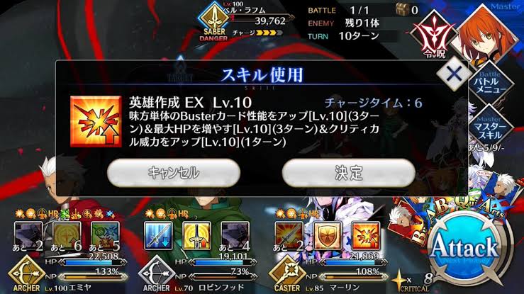 まとめるとマーリンは星、NP、回復、無敵などサポーターが求められる多くの支援をたった1人で行える狂気の存在。Bパ、Aパ、クリティカルパなど多くの場面で活躍でき耐久力も高いから相性不利との戦闘でも使用可能