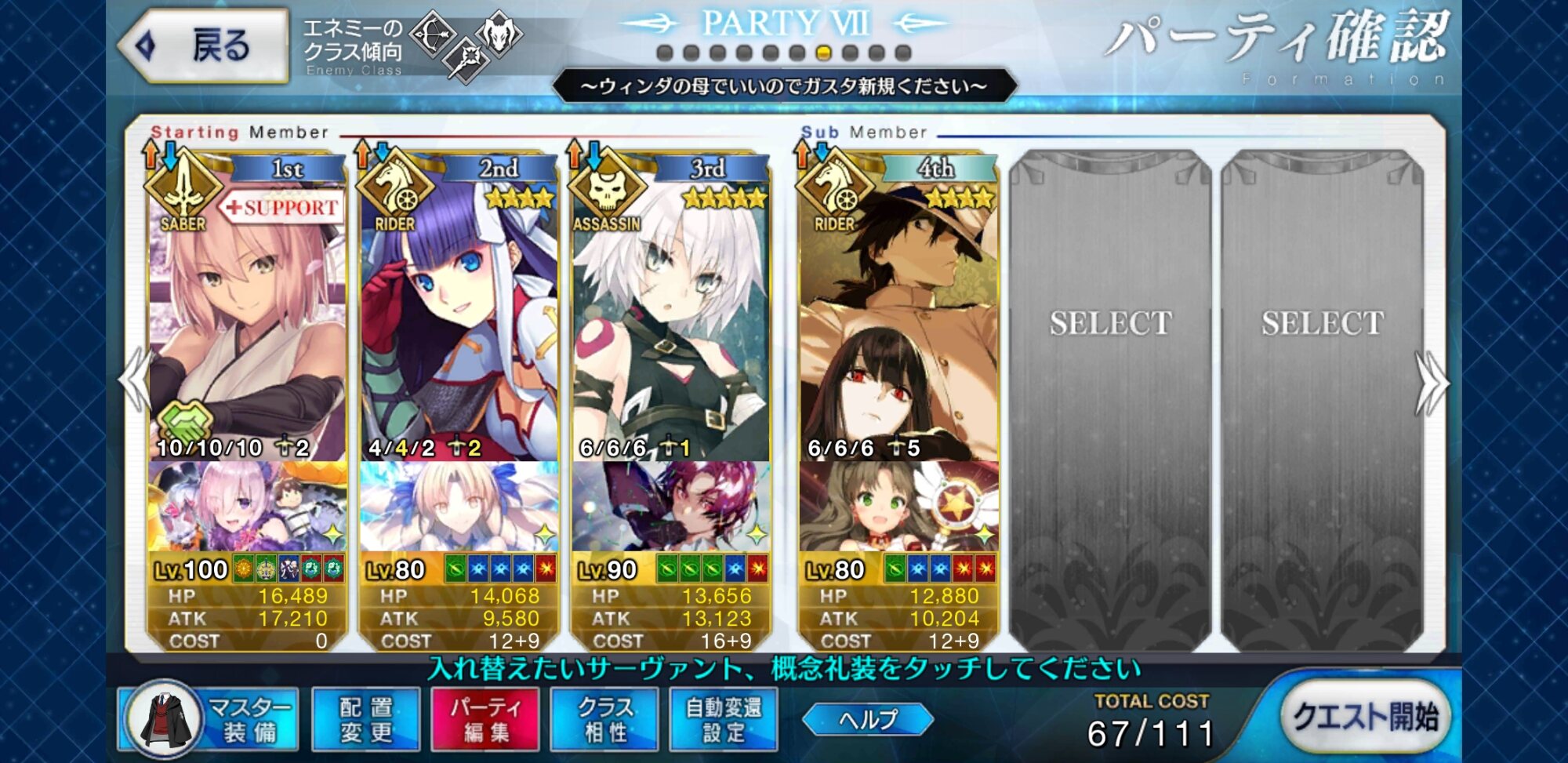 礼装はNP効率上昇系を推奨。星獲得系など、立ってるだけで利益を生む物もいいわ。私のオススメは「2030年の欠片」