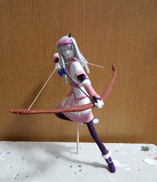 それから塗装も絵の具そのまま感が強いので、適度に混色や重ね塗りしたりグラデーションやシャドー、肌の所ならチークとかを意識したほくがよいかと。水性筆塗りなら最近シタデルとかアクリジョン、ファレホが流行みたいで、色々紹介してるサイトがあるからオススメかな?あと境界など塗り残しも目につくから、色ごとにパーツを分割して塗装するか、マスキングを丁寧にした方がいいかも。