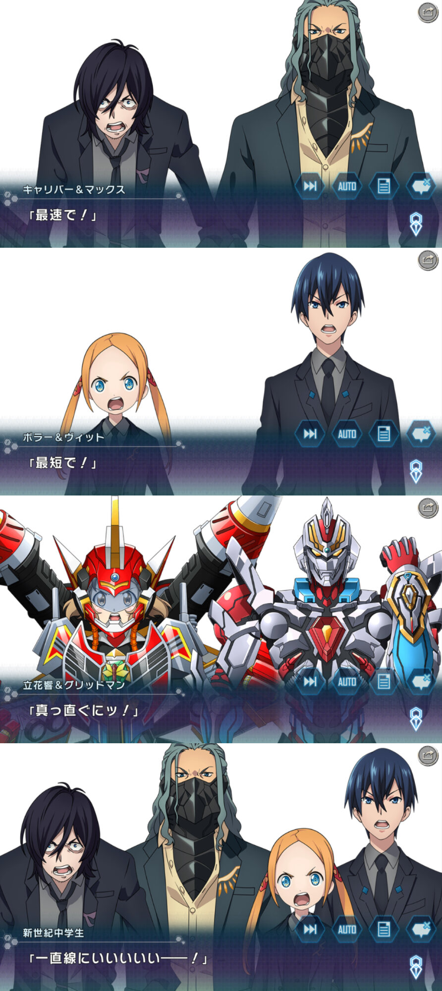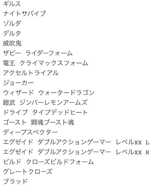 サイクロン!! ジョーカー!!、プテラ! トリケラ!! ティラノ!!! 、コズミック!!イーンフィニティー! イーンフィニティー! 、カチドキ!!ロックオン!!フルーツバスケット!、『ファイアー、オールエンジン!!』、ムゲンシンカ!バッチリミナー!バッチリミナー!、マキシマムマイティX!!ハイパームテキ‼︎ マキシマムガシャット!ガッチャ―ン!レベルマーックス!、グレート!オールイェイ!ジーニアス!!イェイ!イェイ!イェイ!イェイ!、ジオウ! グランドジオウ!!!