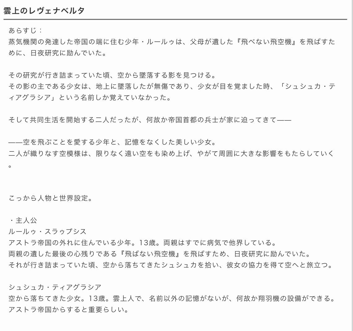 片手間で考えた作品がわりと良い設定で、最後まで考えたらすっぱり決まるとかいう状態になってるので、このまま設定を煮詰めたいのだ。
