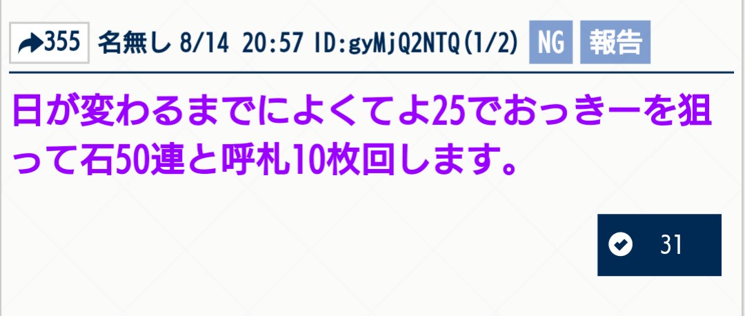 リーク・解析情報等は禁止です、荒らし・誹謗中傷等は無視し、報告・NGにて対応してください。煽りや荒らしは完全無視が最も効果的です。反応するあなたも同類です。他所への内輪ネタの持ち出しは控えましょう。二次創作物の無断転載禁止、公式関係者のイラストや転載が許可されているものに関しては必ずリンク先を併記してください。最終再臨や霊衣解放のイラスト、最新シナリオ内の画像や話題などは配信、実装から2週間は控えてください。