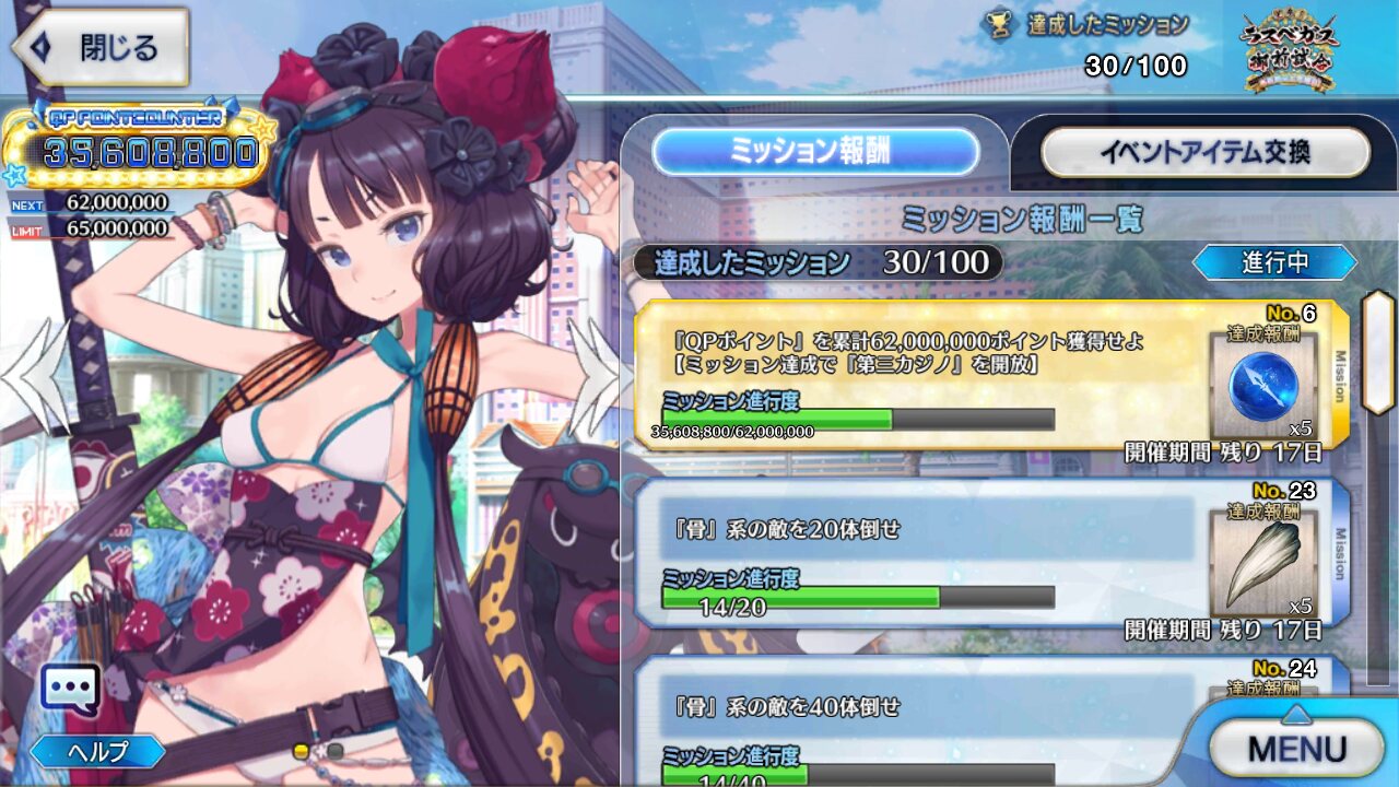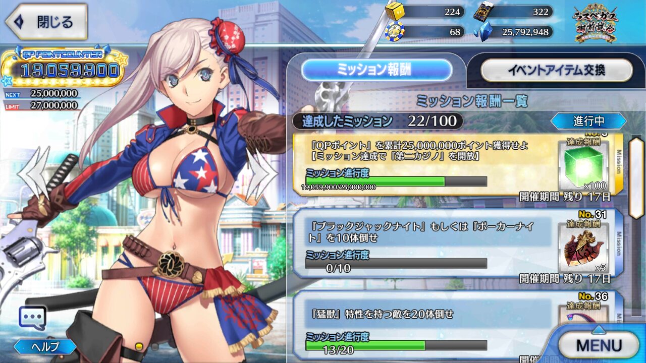 サバゲー、セレブときて次のカジノはどんなのだろう。しかし、武蔵ちゃんの発言から、ミッションとかの上限は1億くらいとタカをくくってたけど、いっきに六千万とは…。三億くらいになっちゃう?