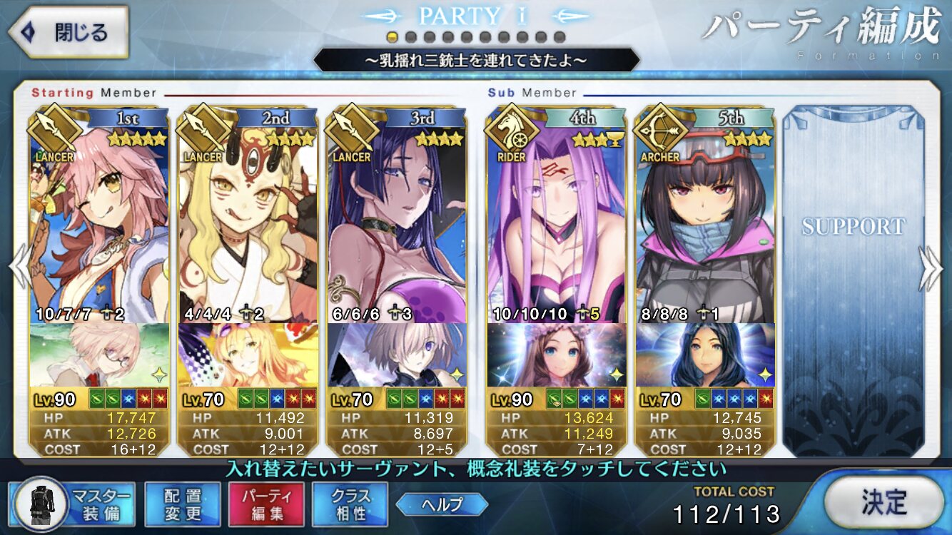 凸カレで使いたい編成があってウズウズしてるが、凸なくても3つか二つは持っておきたい編成もあるしな・・・悩む武蔵ちゃんと2人で冒険をしてぇなぁ