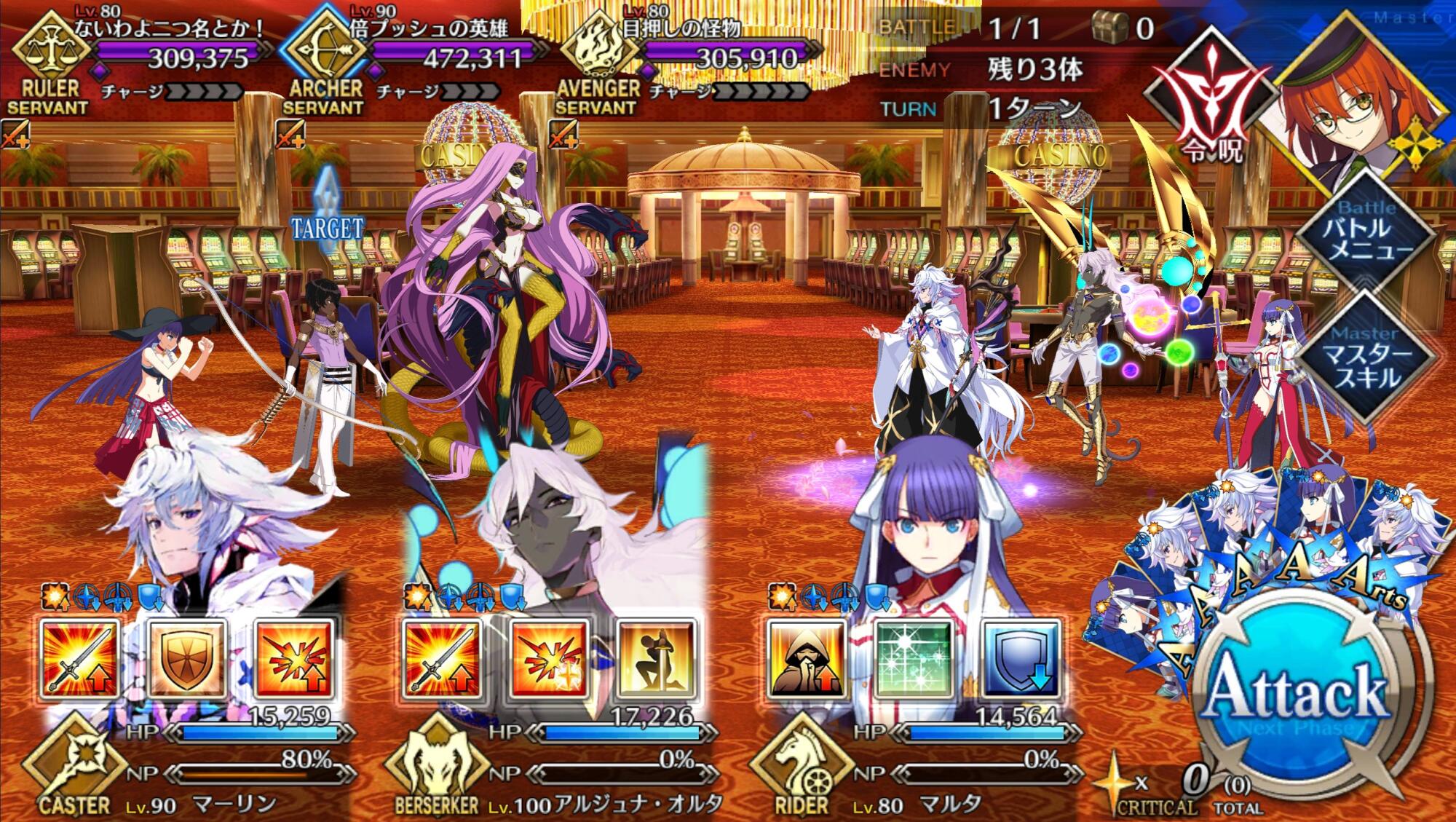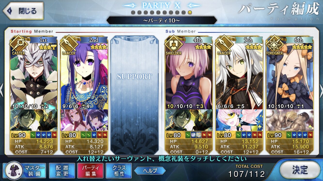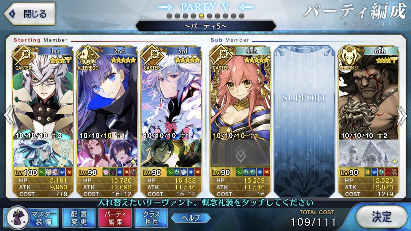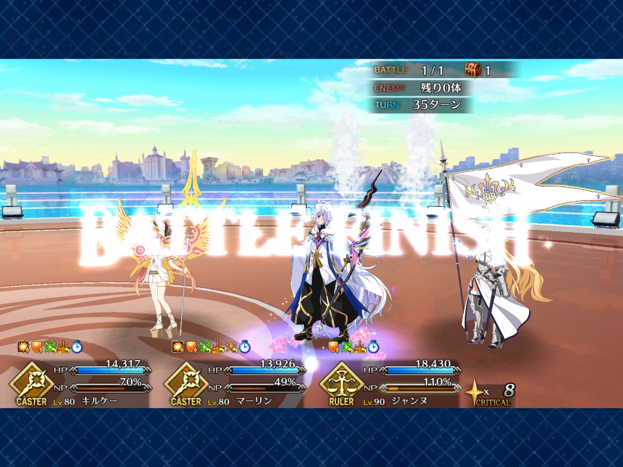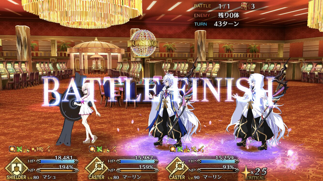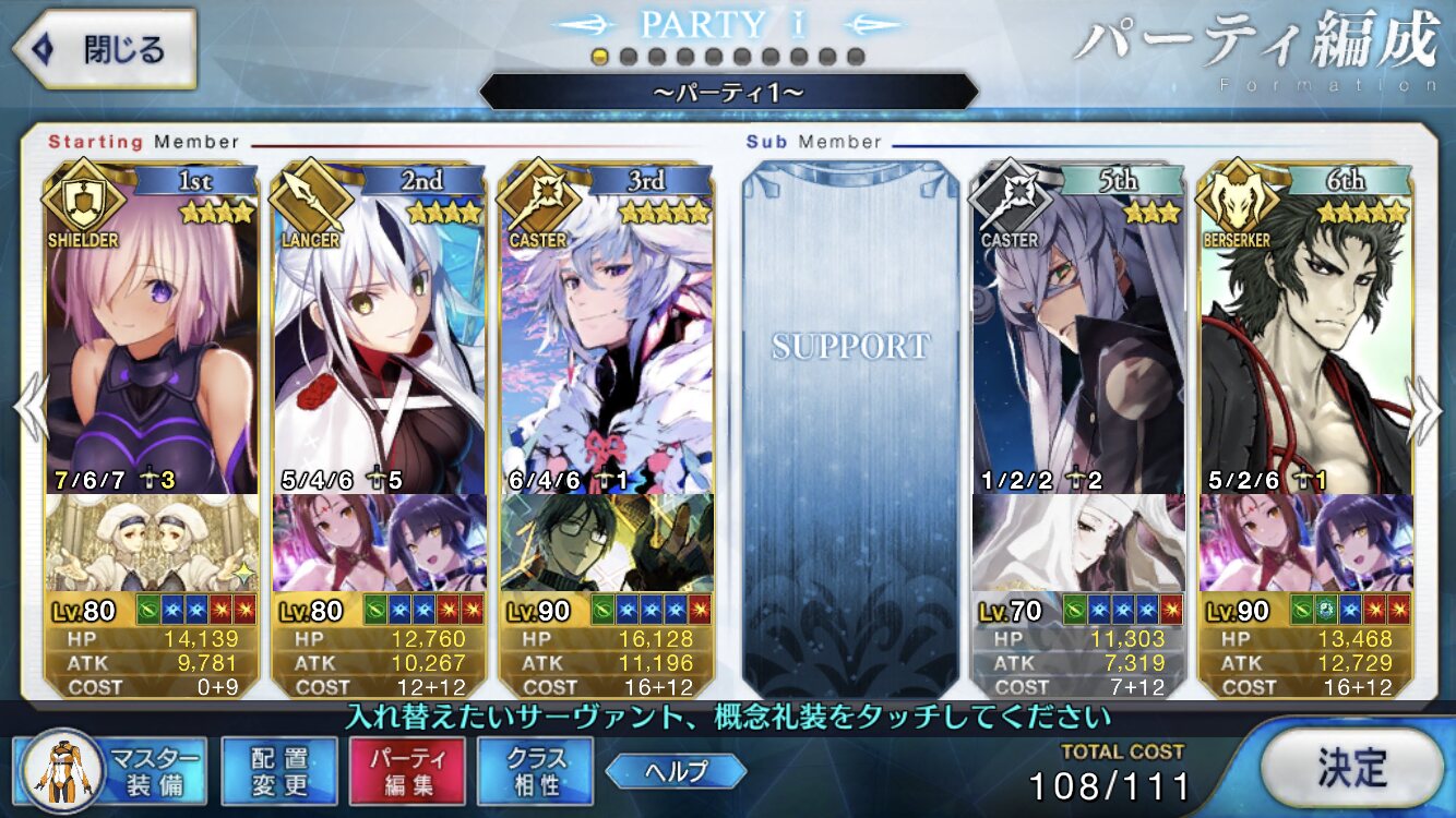 本垢の方はマーリン無しで行ってもっと危なっかしかったんだよなぁ……高難度、前回はマシュマーリンフレジャンヌのガチガチ耐久パ組んで84ターンかけて倒したんだよな…