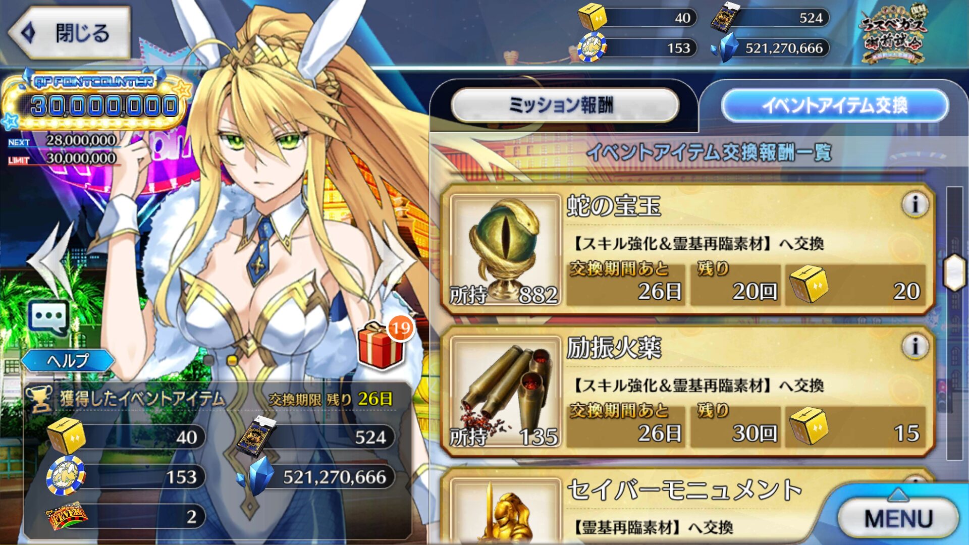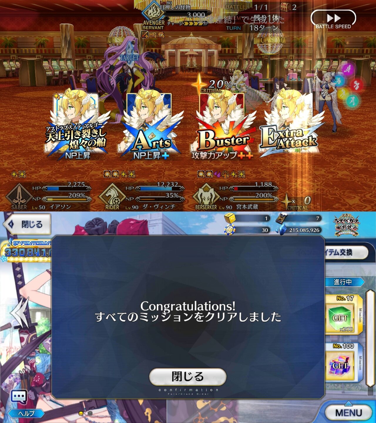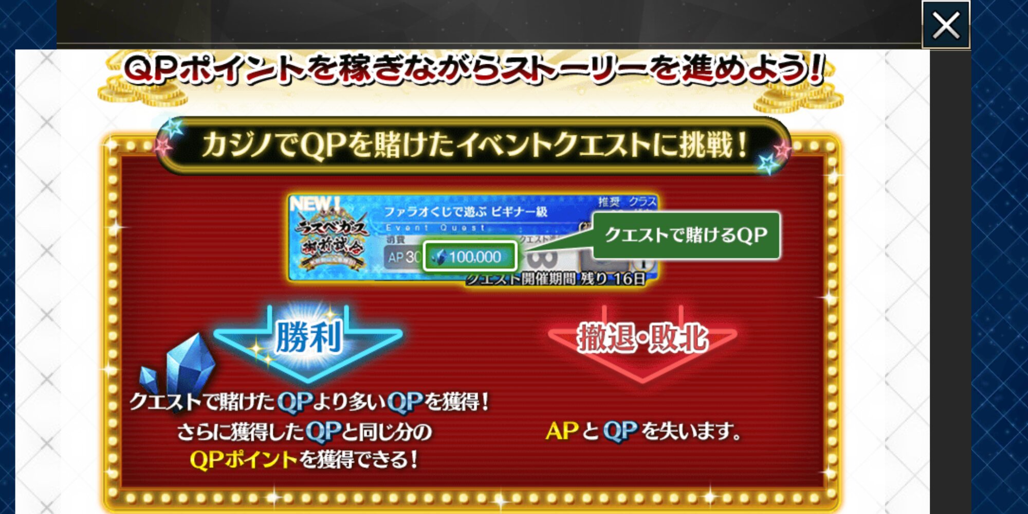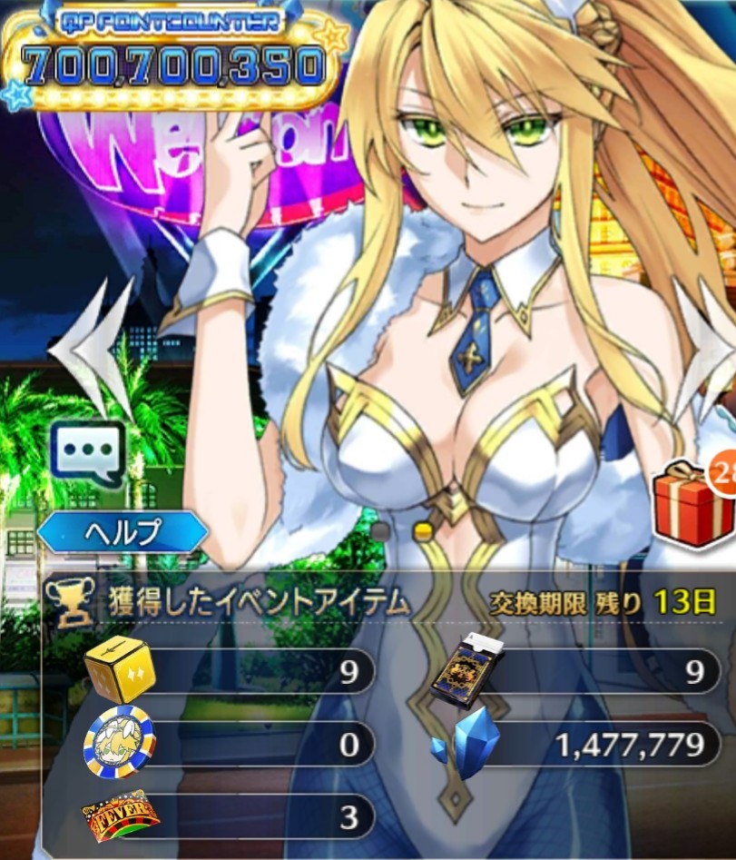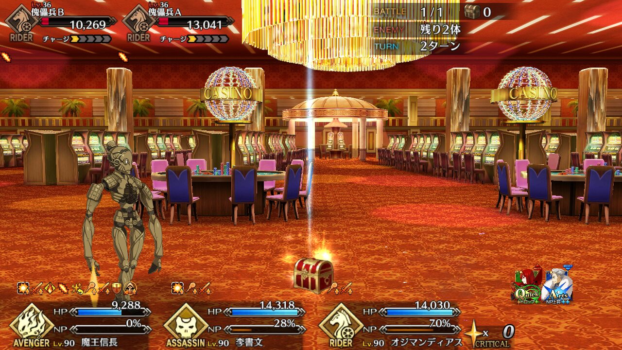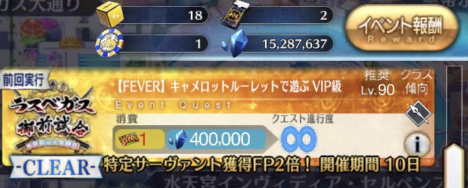残り2つのカジノでも追加クエストあるか?QPが美味い…軽く見積もっても礼装積んでミリオネア級のフィーバーを(そんなにチケットまだ無いけど)20回周回するとだいたい1億か…
