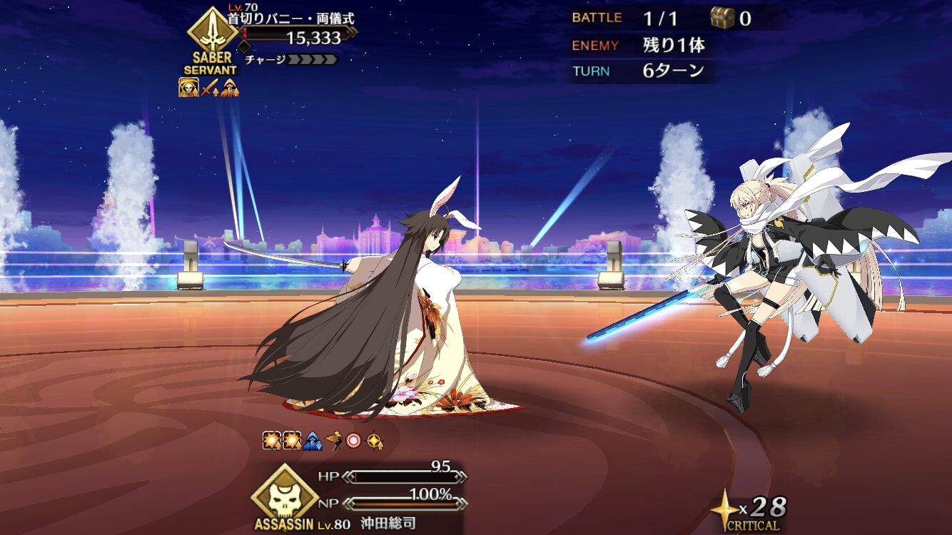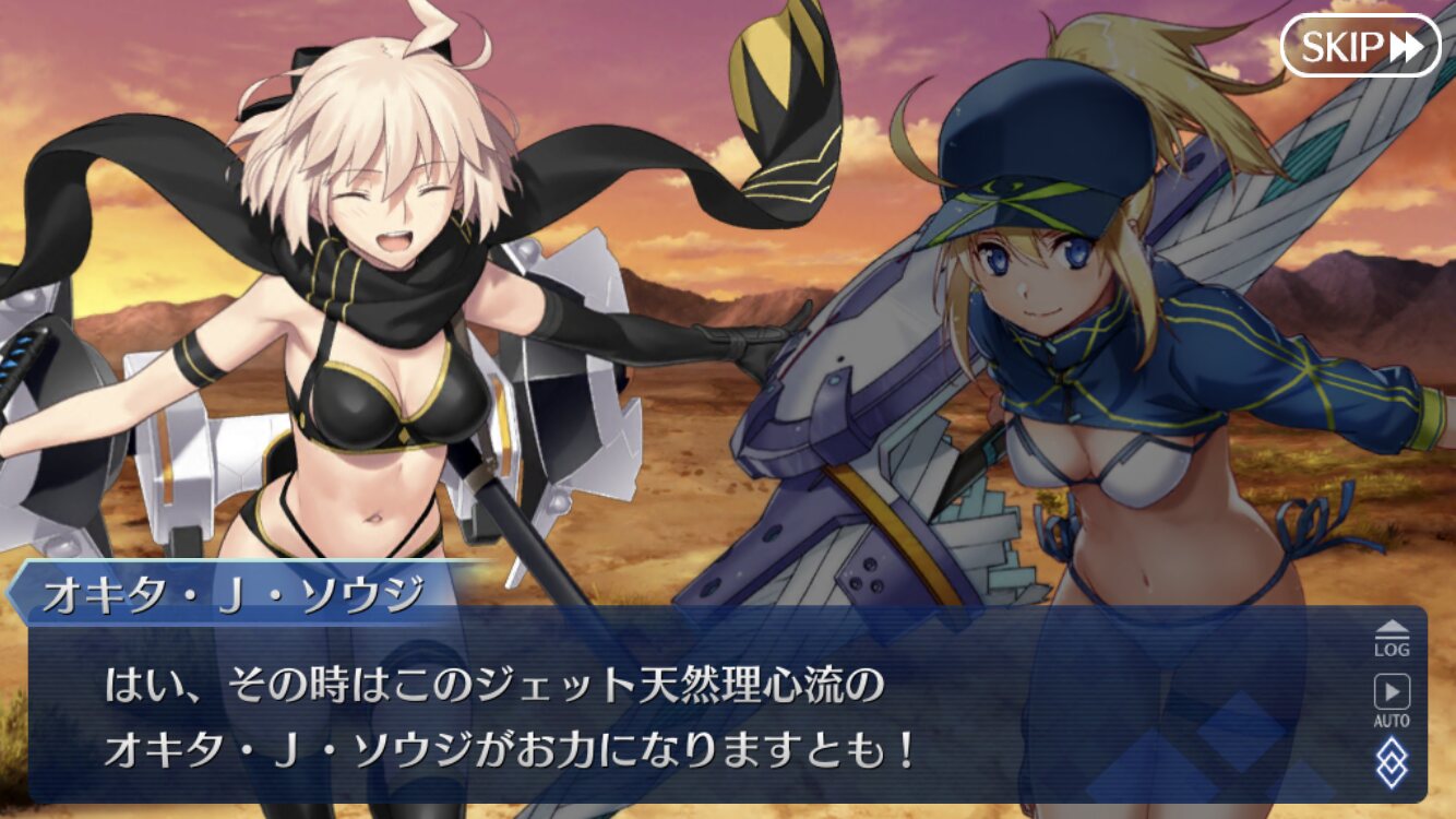 天魔武蔵戦でブレイクさせる度にバルムンクで援護飛ばしてくれるの本当に頼もしかった。割とギリギリだったんで二ゲージ割った後にガッツ入った時は割と青ざめたんだけど即解除してくれたもんな。夏の度に霊基が夏モードになってジェットが生えてくる沖田さんかぁ…