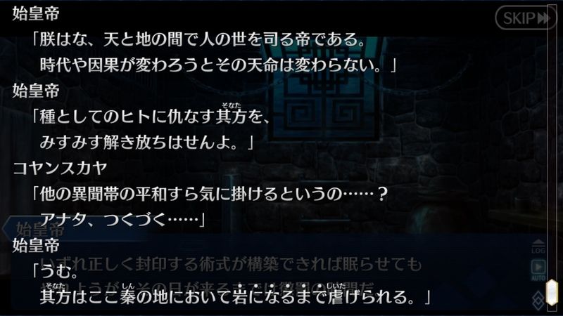 前者はどんな状況でもFGOの世界観である限り根底に人類史の危機ってのがあるからまだ安心だが、始皇帝の場合は世界や主人公の在り方如何で始皇帝の気分が変わる不安定なもの。そりゃあダメな要素がありゃあ全力で秦帝国を再建しにかかりますよ