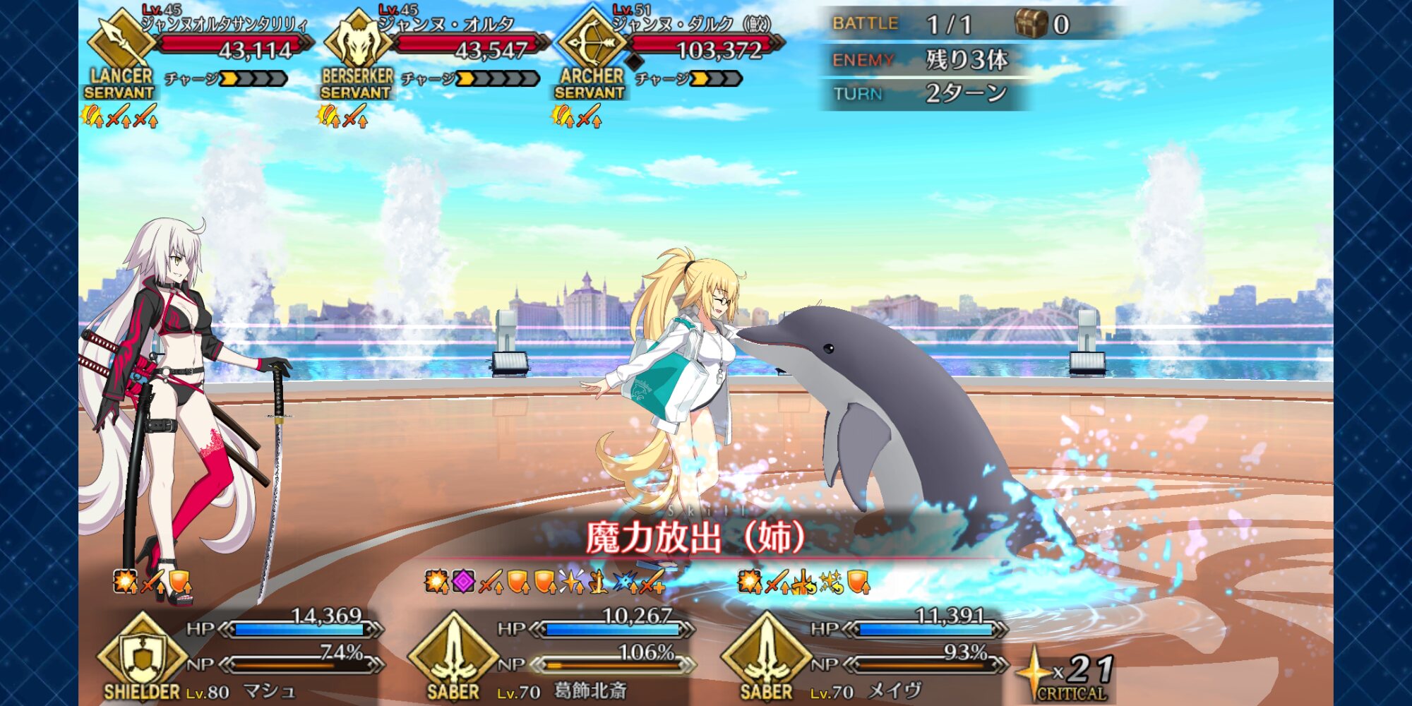 水着武蔵ちゃんが「嫌いなもの」として挙げた「遊びのない自分」って、天魔武蔵か式の即死こわいなーと思ったけど宝具を打たせなければ良いということに気づいて水着我が王に宝具連発してもらいつつ玉藻にチャージ減らしてもらって宝具打たせず倒したわ