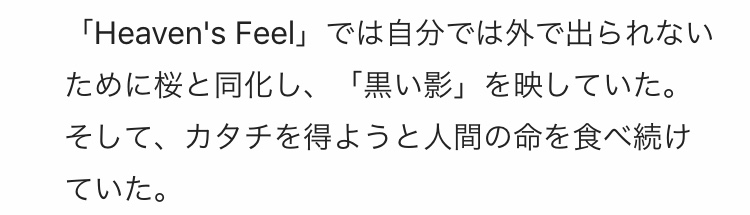 まだ一部分だけど士郎を含めた大切な人達の前で幸せでいたいと言う歌詞も海から出て自分の意思で桜満開の春へと歩き続けるジャケイラもどっちもHFでの事を経ての桜の成長を感じで本当に素晴らしくてもう泣きそ…