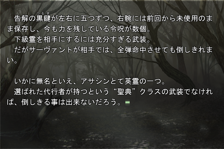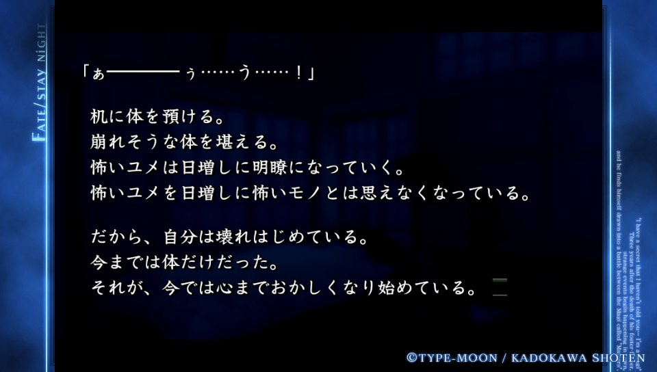 エミヤを流しながらの「固有結界"無限の剣製"使用不可」「リンゴの皮みたいにみっともない」「神速を以て凌駕する」とか印象深い文章をどう表現するかたて乙