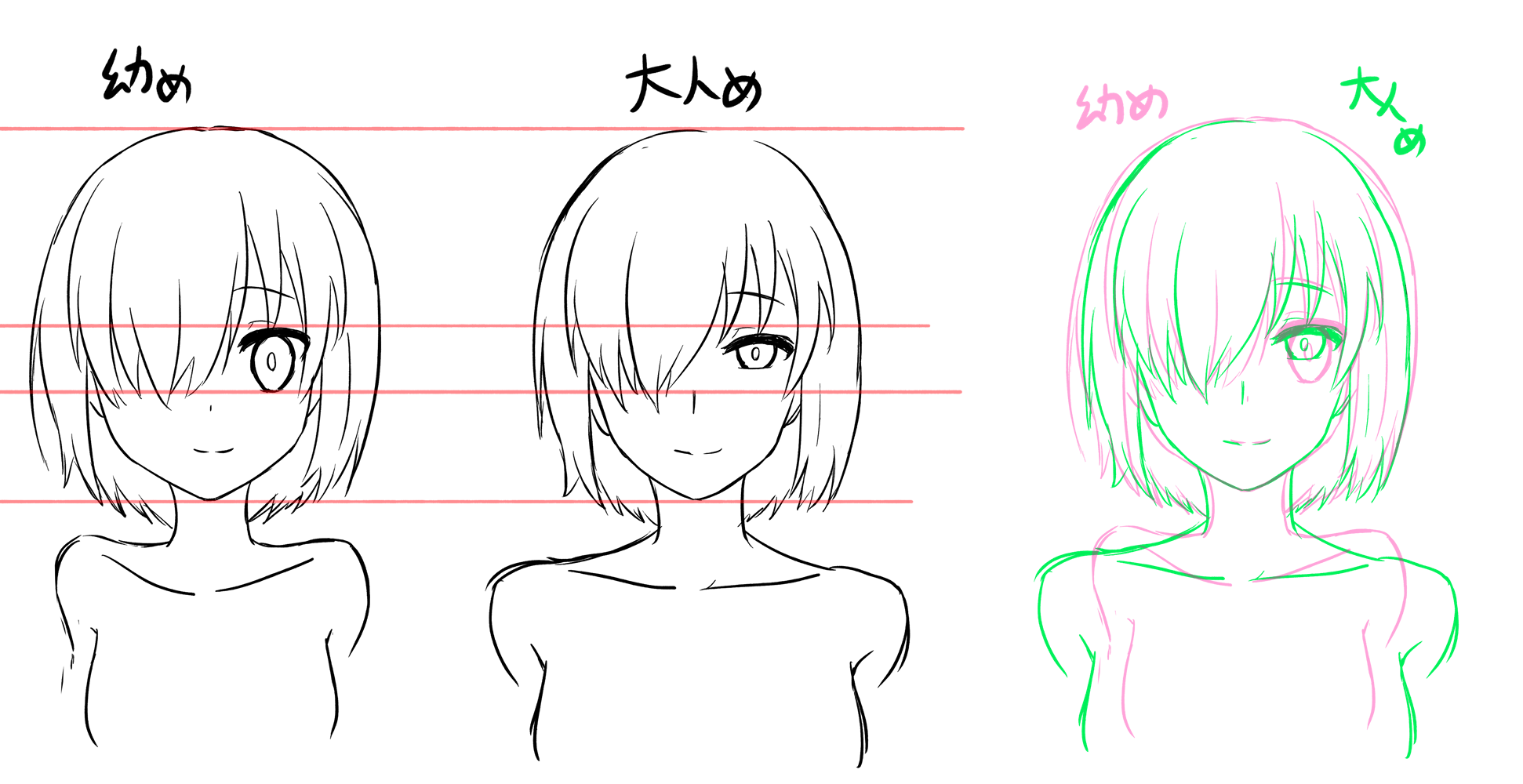 私の中で可愛い=幼い少女だから年齢差意識して、極力瞳と肩幅以外は差が出ないように描いてみたけど、若干首と輪郭幅が違うからきっと老いるとそういう定めなんだよ。(描いた後で重ねました)(幼めで肩上がってるのは趣味)(鼻や口の位置やらズレててあばばば)
