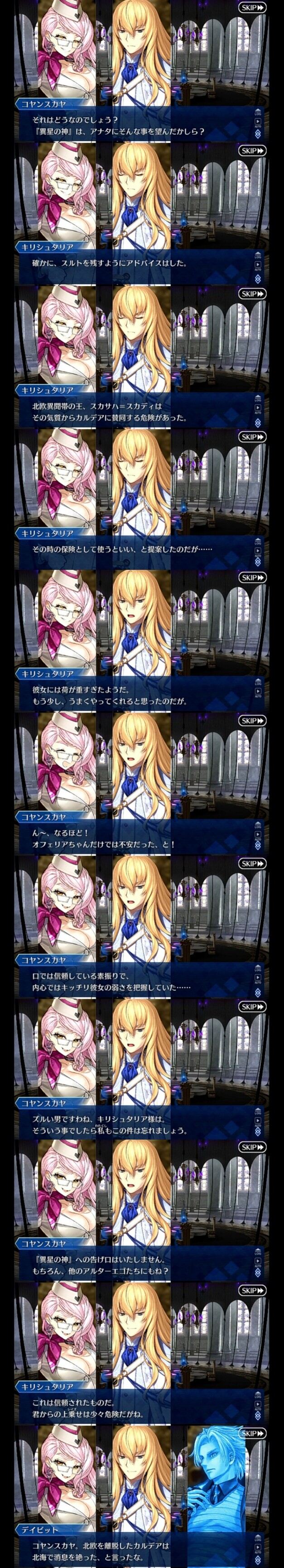 もしかしたら7章で分かるんじゃない? XXが言ってた膨張する太陽を幻視する祭壇は7章の事だろうし、それに担当クリプターがデイビットなのも怪しい考察というほどの話ではないんだがスキルが士郎の固有結界のように『天は巡らず』が地動説の再現、『地は動かず』が天動説の再現という可能性はあるだろうか