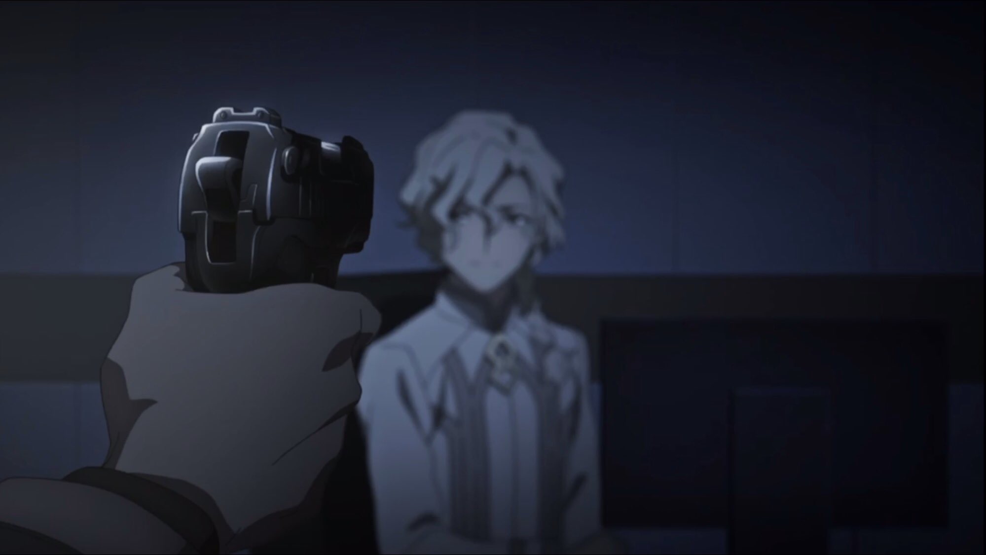たとえばデイビット=ブルーブックだとして、三章の冒頭でブルーブックを銃撃した人物がマリスビリーなら、ああやって「銃を向ける」というのは、あの三章冒頭の状況を逆転して再現して見せることで